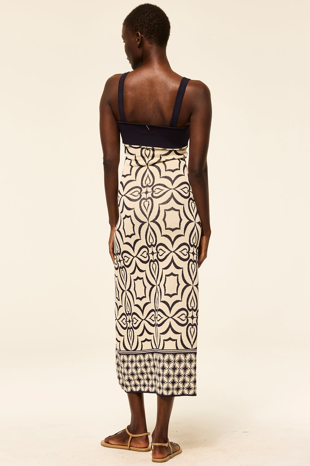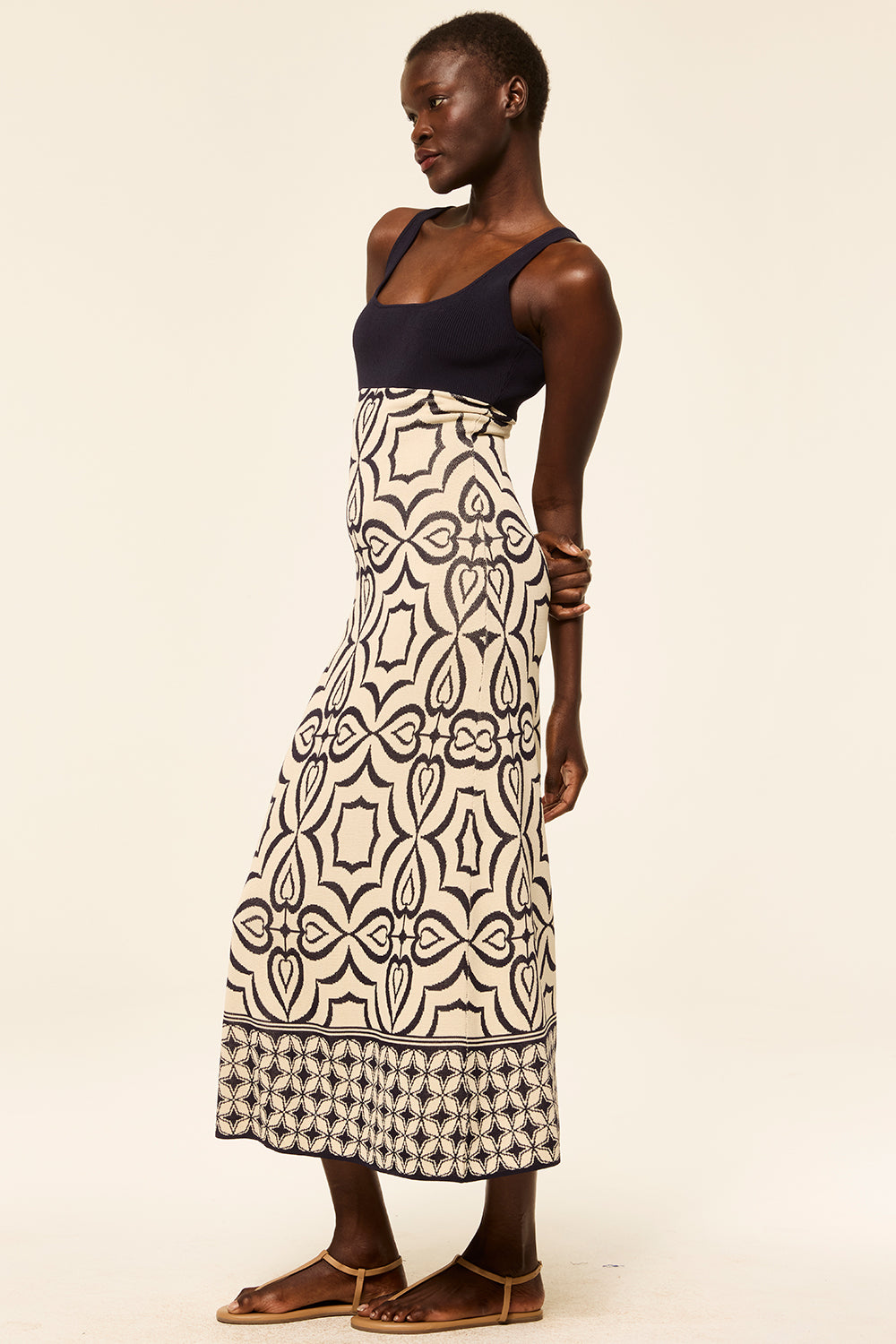 The Kalil knit dress is a maxi length fitted silhouette in navy and ivory mosaic tile print knit jacquard. Sleeveless with thin straps and a square neckline and back. Pull-on style with a ribbed bodice.