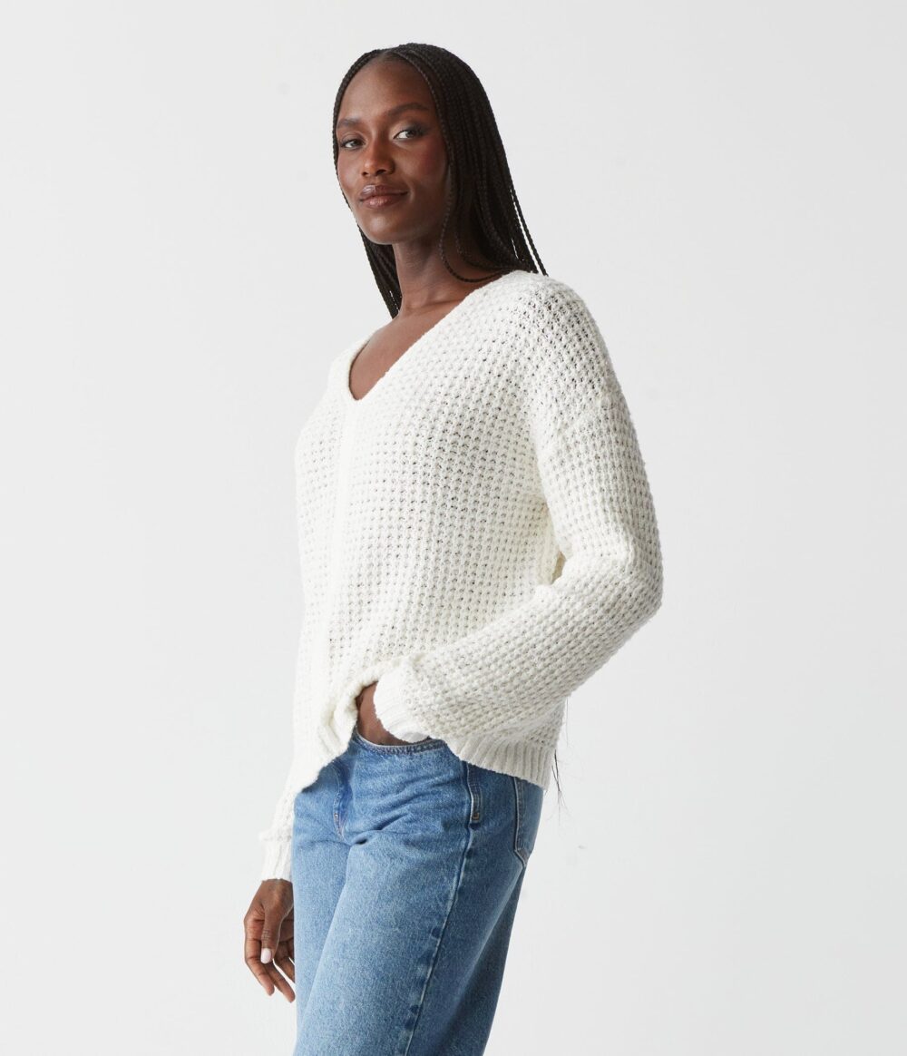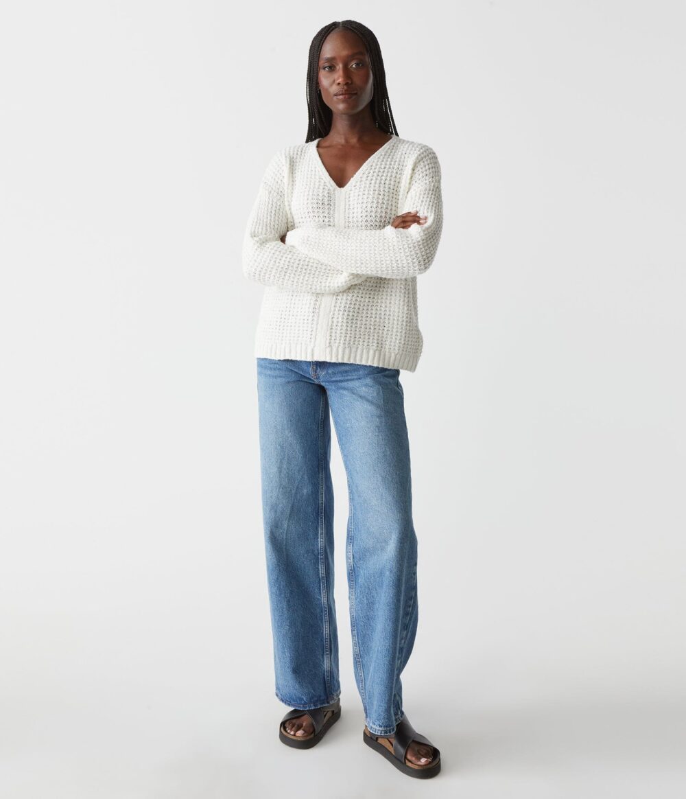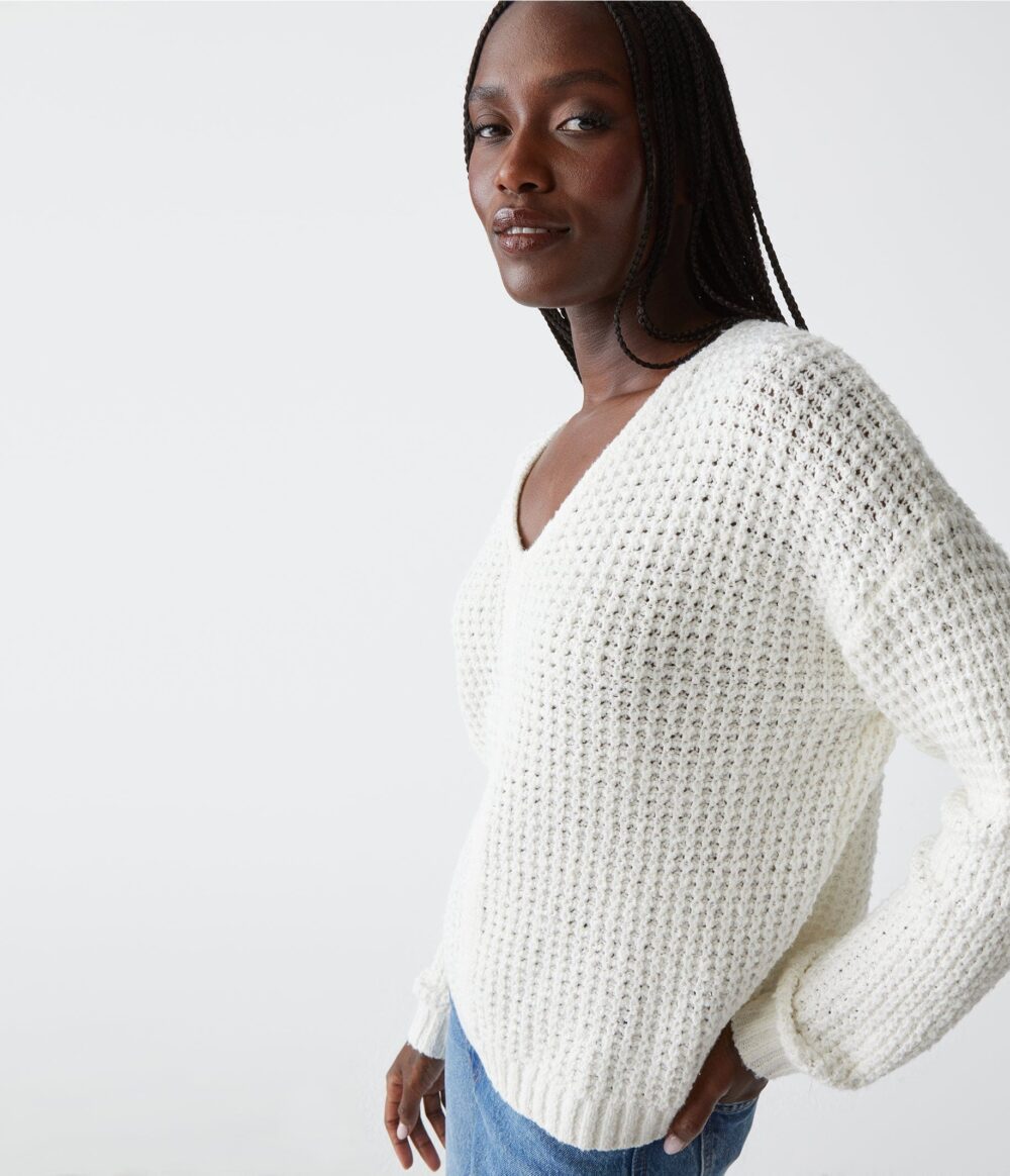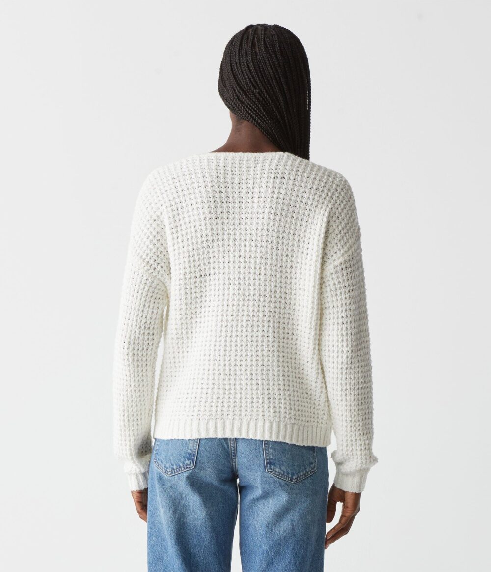 Kelsie is a classic v-neck sweater with a waffled texture and center-front seam detail, perfect for lightweight layering.