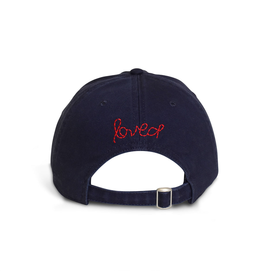 KR’s Imperfect Heart Hat, made from cotton-twill in classic navy with a red Imperfect Heart Patch on the front and her embroidered ‘loved’ over the adjustable tab at the back. It’ll make any outfit you style it with look effortlessly cool.