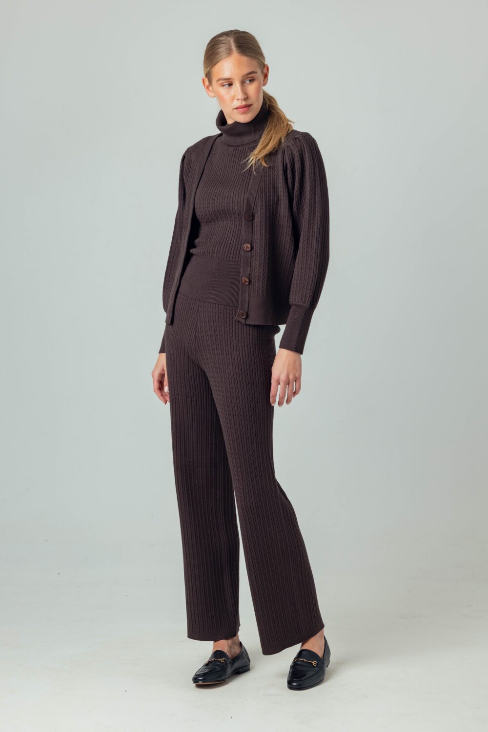 A classic cable knit cardigan, elevated with gathered puff sleeves and wide ribbed cuffs. Designed with a V-neckline and button-front closure.