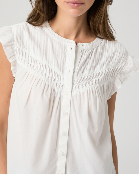 This feminine white blouse is crafted from semi-sheer 100% cotton that’s perfect for the summer months. Designed with thoughtful details, the Levanto Blouse features a mandarin collar with buttons down the front, short flutter ruffle sleeves, and novelty pintuck yoke accents at both the front and back. Delicate shirring throughout adds a touch of elegance to this light and airy must-have.