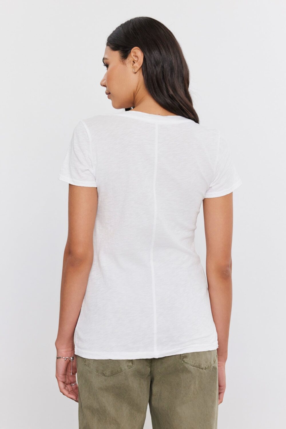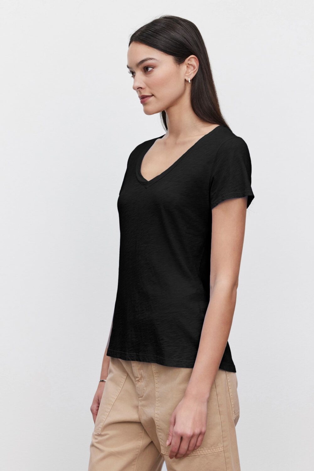 This V-neck tee will be on heavy rotation. Made from luxurious cotton slub, it offers exceptional softness, easy care, and a flattering fit. With short sleeves and a banded neckline, this tee is a versatile addition to your wardrobe.