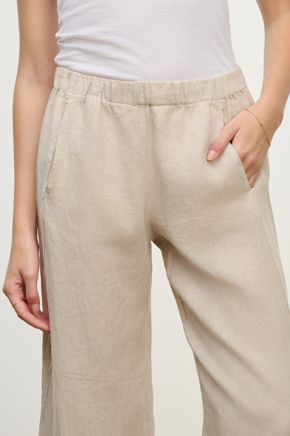 The perfect pant. Crafted from a lightweight linen woven, these pull-on trousers have an elastic waist, a relaxed leg with a slight ankle crop, and the perfect ease of a gorgeous warm weather day.