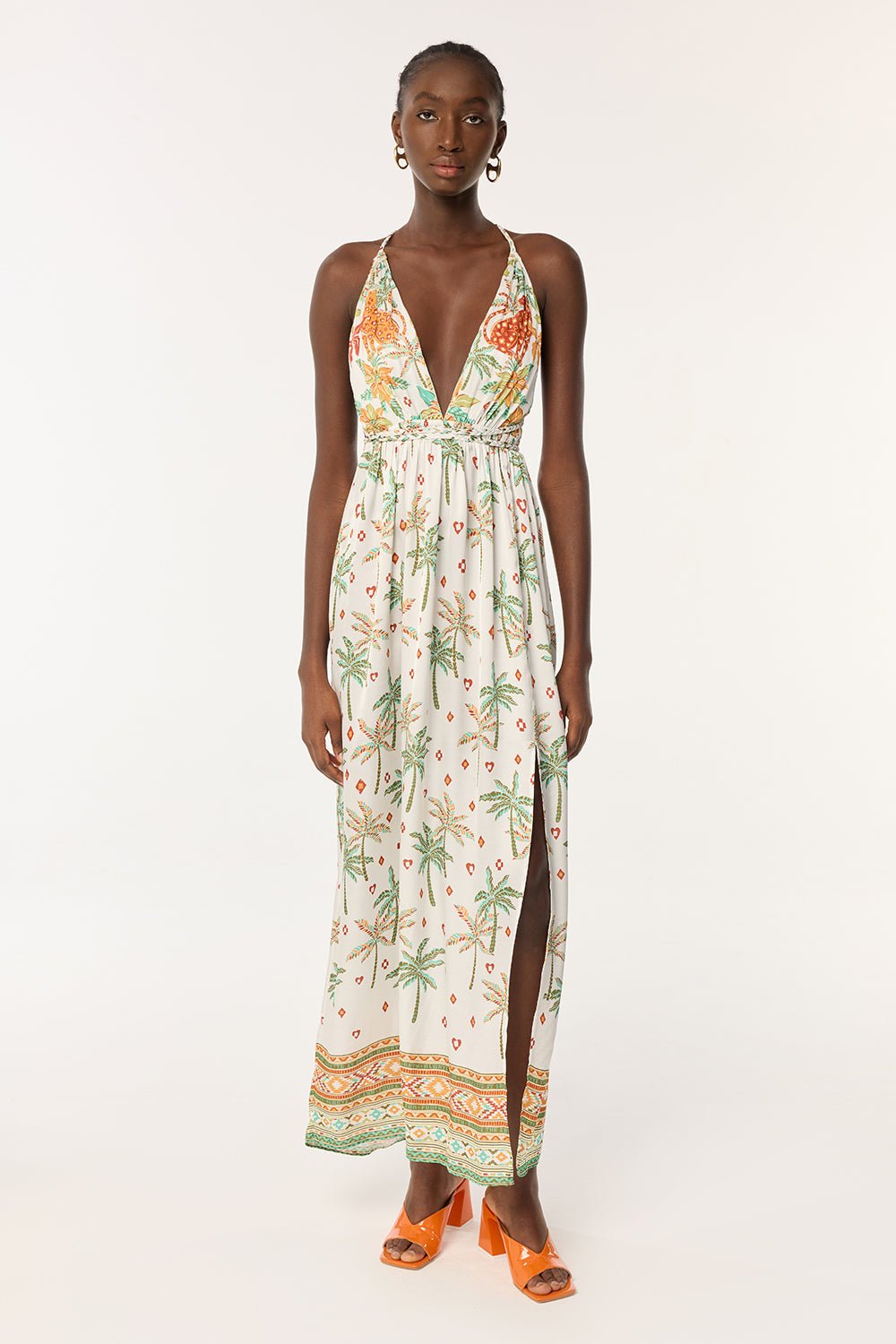 Two long cords adorned with discreet beads delicately cross the back before cinching the waist, enhancing the silhouette. A subtle side slit adds a sensual touch, gracefully revealing the leg.