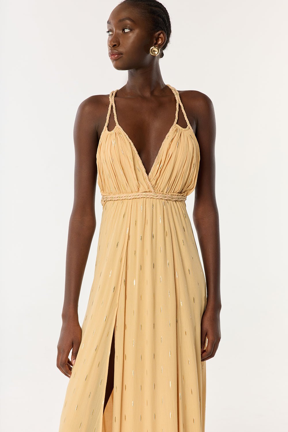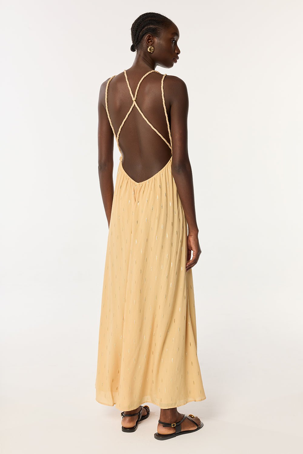 Elegant cords highlight the waist, adorn the neckline, and delicately cross the back to form adjustable straps. Subtle slits at the hem of the dress add a touch of fluidity, ideal for graceful movement.