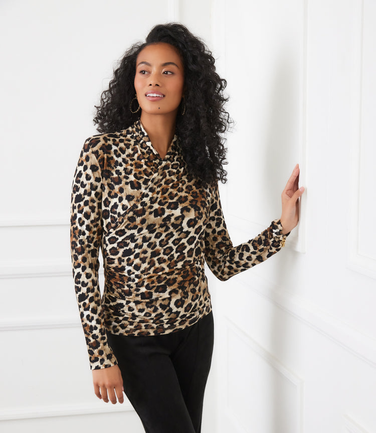Long Sleeve Crossover Side-Shirred Top – Leopard