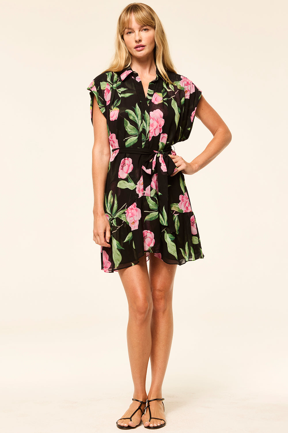 The Lora dress is an easy mini silhouette cut from a Pink Peony printed black chiffon. A covered button front placket goes to the hem. Fold-over collar and short sleeves that are gathered at the shoulder. A curved wide ruffle hem and optional self-tie belt finish off this effortless style that will take you from this season to the next.