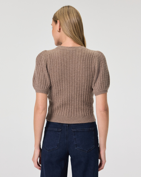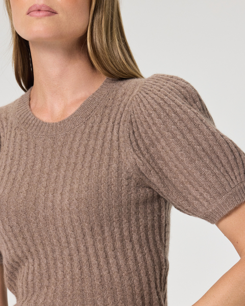 Crafted from 100% cashmere with a cable knit stitch throughout, this heather brown short sleeve sweater tee features a slim body and puff sleeves. We’ll be wearing the Lucerne Top with every shade of denim all season long.