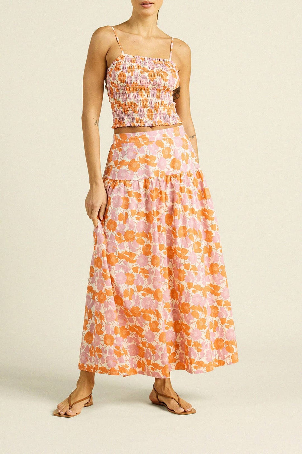 The Lydia Skirt is a full midi-length skirt with a smooth waistband and a flattering hip panel with seamed gathers at the hips, which release into a sweeping hemline. Side seam elastic provides a comfortable and flexible fit. Featuring our signature side seam pockets. Shown here in Poppy Dawn and made from our cotton poplin.