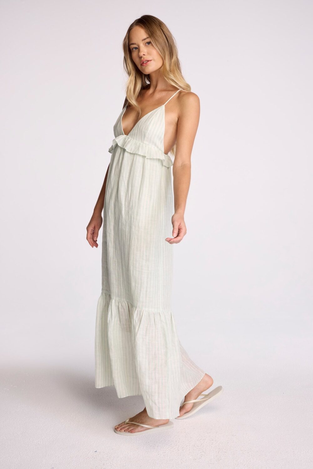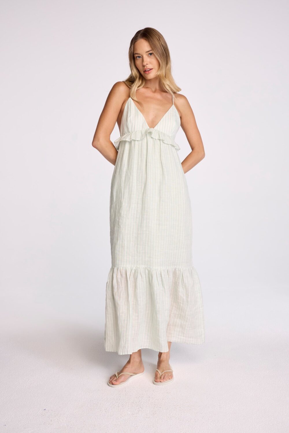 Introducing Marceline, the must-have dress for spring. Made from breathable 100% yard dyed linen, this tiered ruffle dress offers both style and comfort. Triangle cups creating a plunging flirty neckline that is complemented with a tiered soft ruffle trim. Marceline features refined adjustable straps to ensure an effortless fit, this maxi length dress will sit just past your ankles.