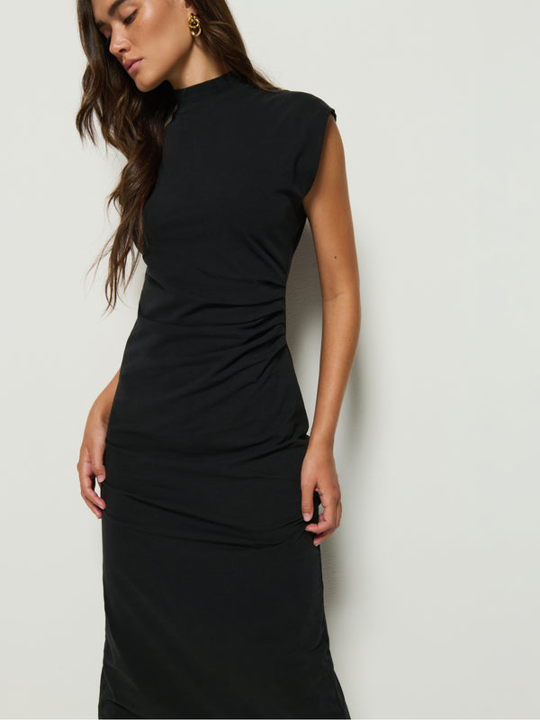 Your new go-to. This effortless dress features a folded mock neck, a center back slit for easy movement, and an asymmetric knife pleat detail at the waist that flatters in all the right places. This one comes in Jet Black.