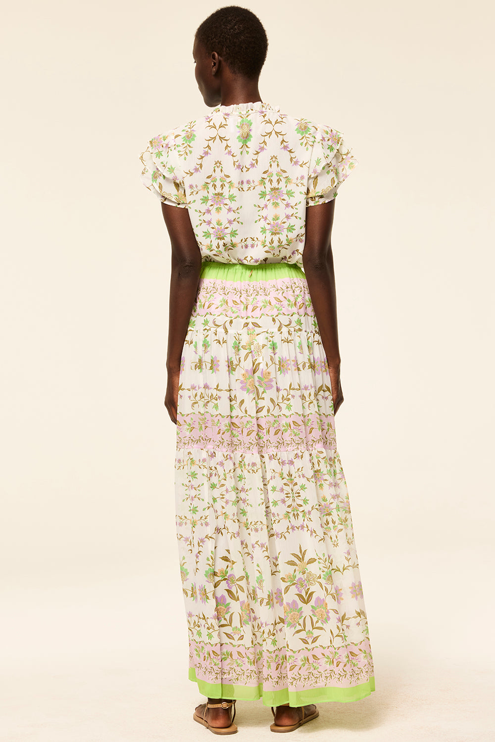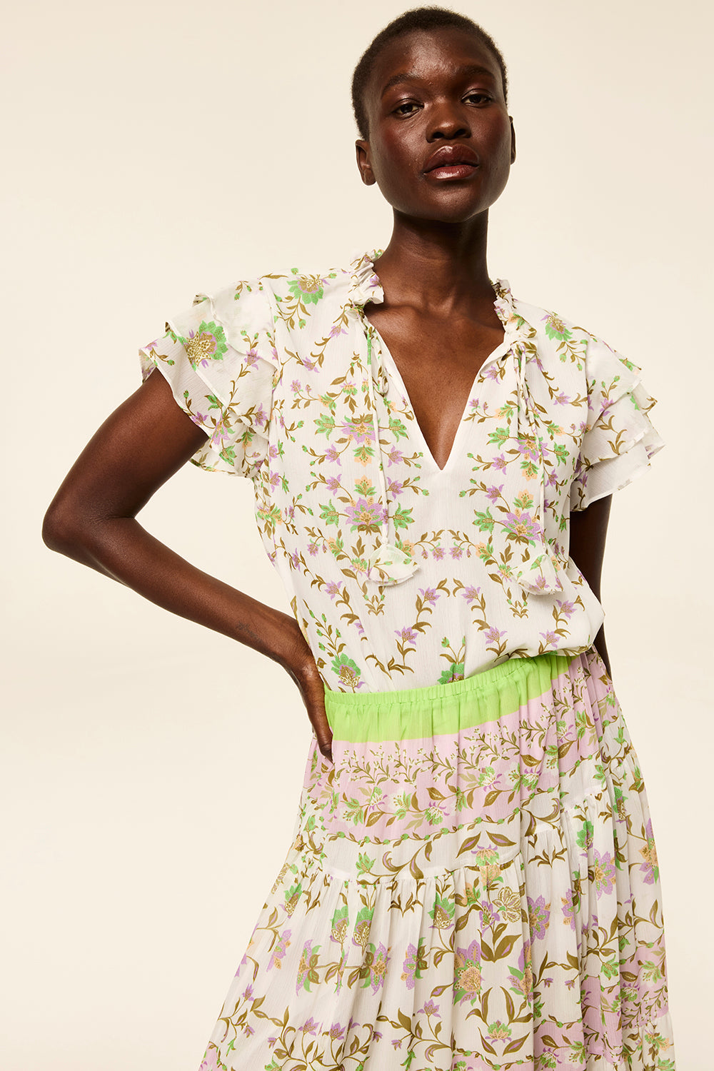 Cut from a gorgeous Secret Garden Floral print chiffon, the Maria top is an easy silhouette with short, tiered ruffle sleeves and a ruffle trimmed split neckline with Misa’s signature petal tassel ties. The body is self-lined.