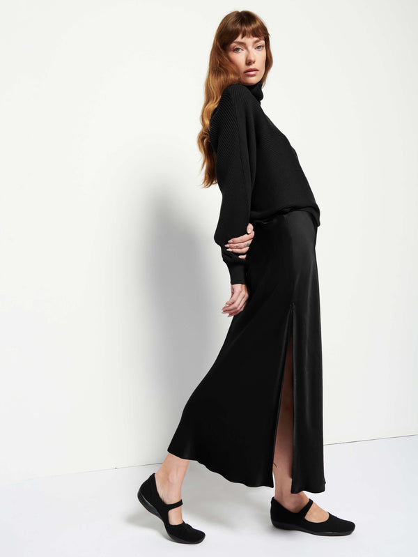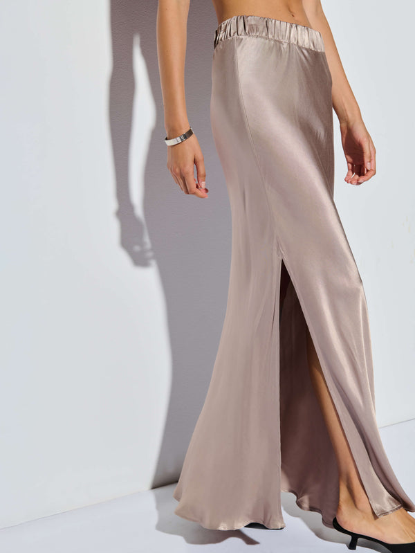 A luxe Hammered Satin skirt with an elastic waistband and a high side slit. Cut on the bias which means a perfect slim fit that hugs all the right places.