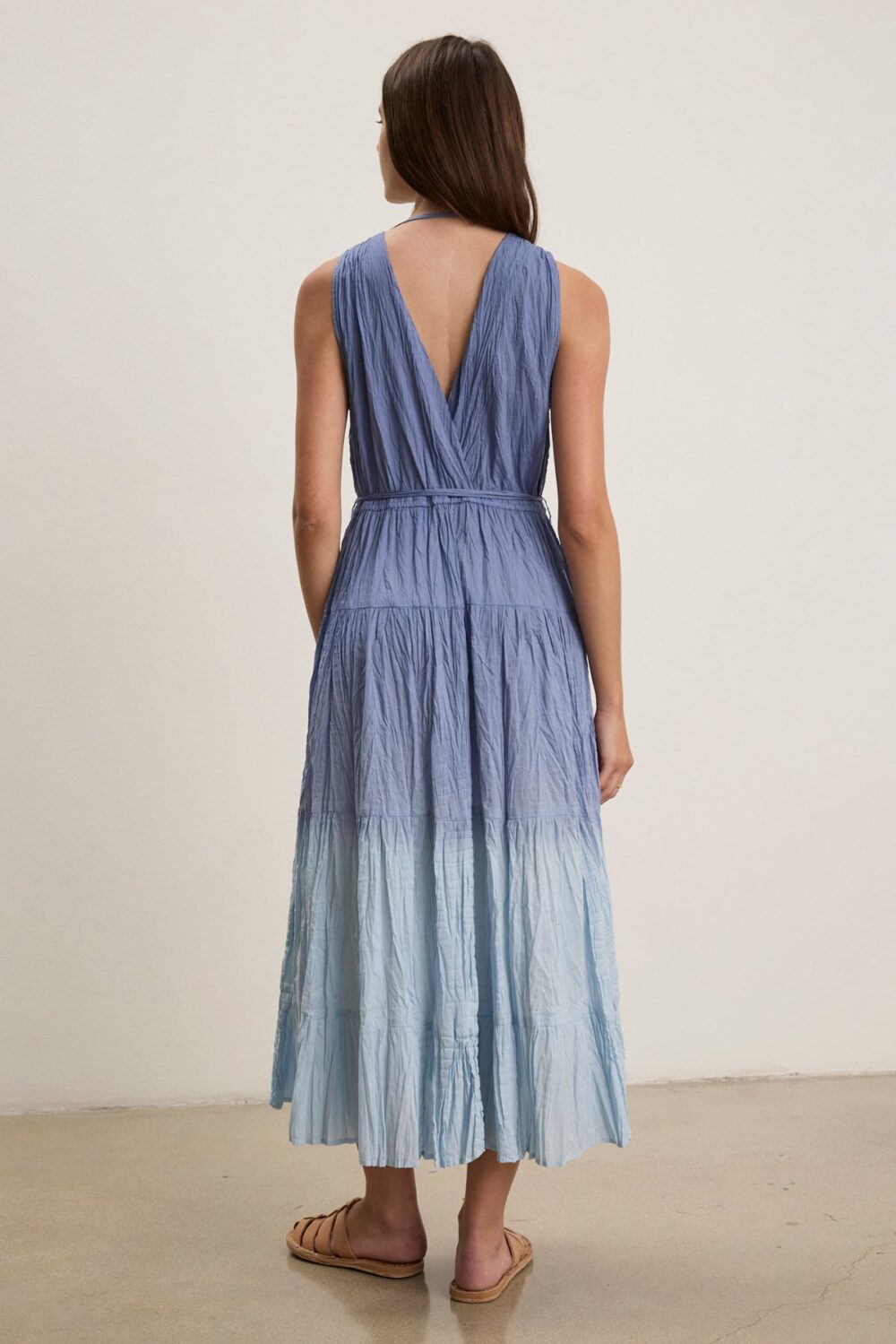 Designed with a wrap front V-neck and tiered silhouette, this dress offers a flattering, feminine fit. A detachable belt with beaded detailing adds a touch of elegance, while the unique dip-dye crinkle voile ensures each piece is one-of-a-kind.