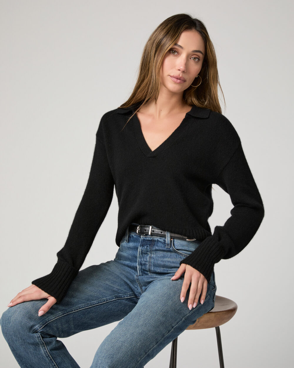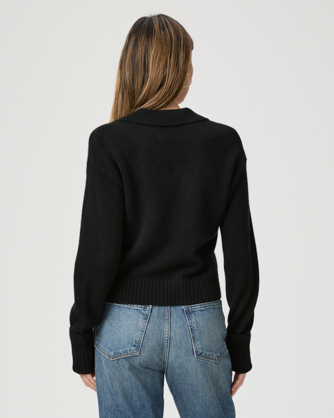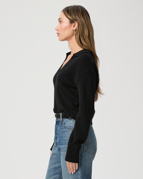 Crafted from Eco Cashmere, this black collared polo sweater features cuffed ribbed sleeves and a classic v-neckline. We’ll be wearing this beauty with every shade of denim all season.