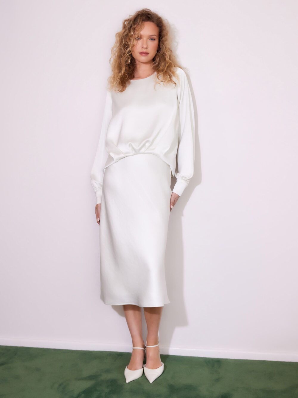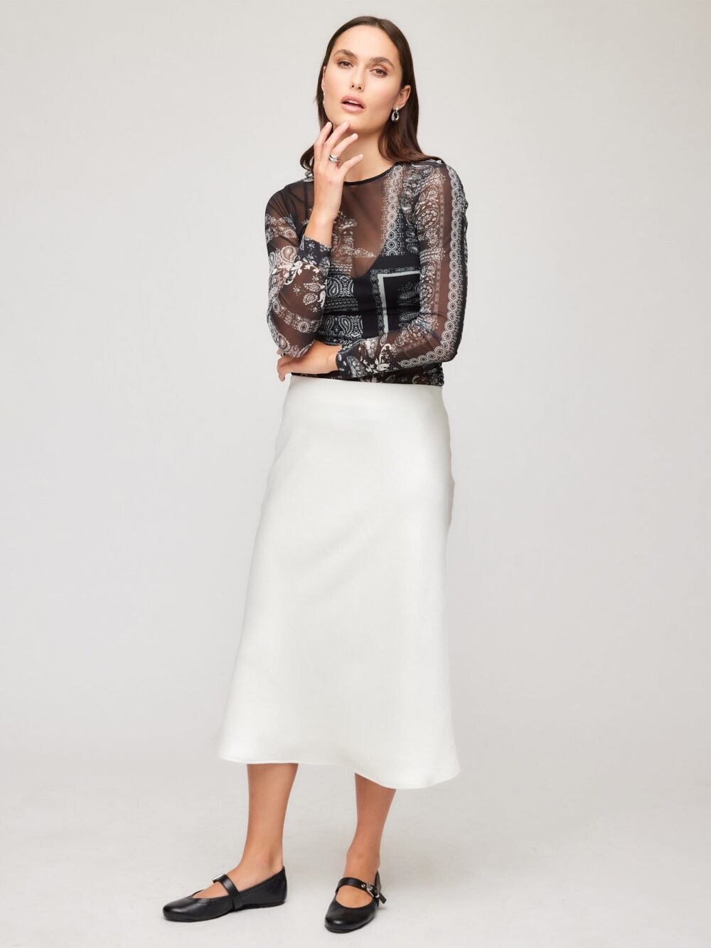 Crafted from elegant satin material, this skirt boasts a bias cut for a flattering silhouette. Versatile and effortlessly stylish, pair it with the Blouson Satin Top for a complete, sophisticated look.