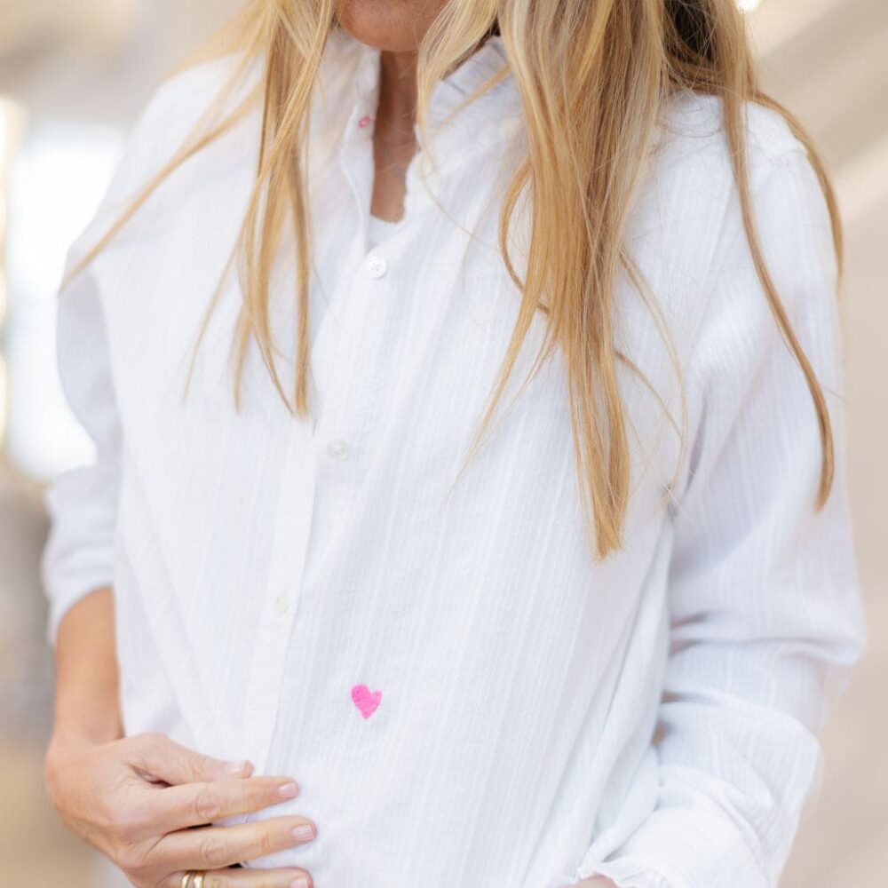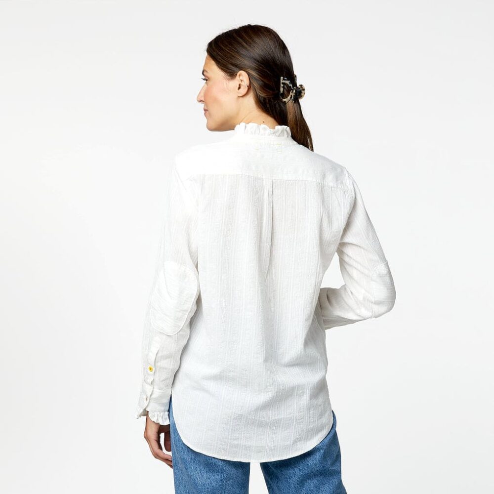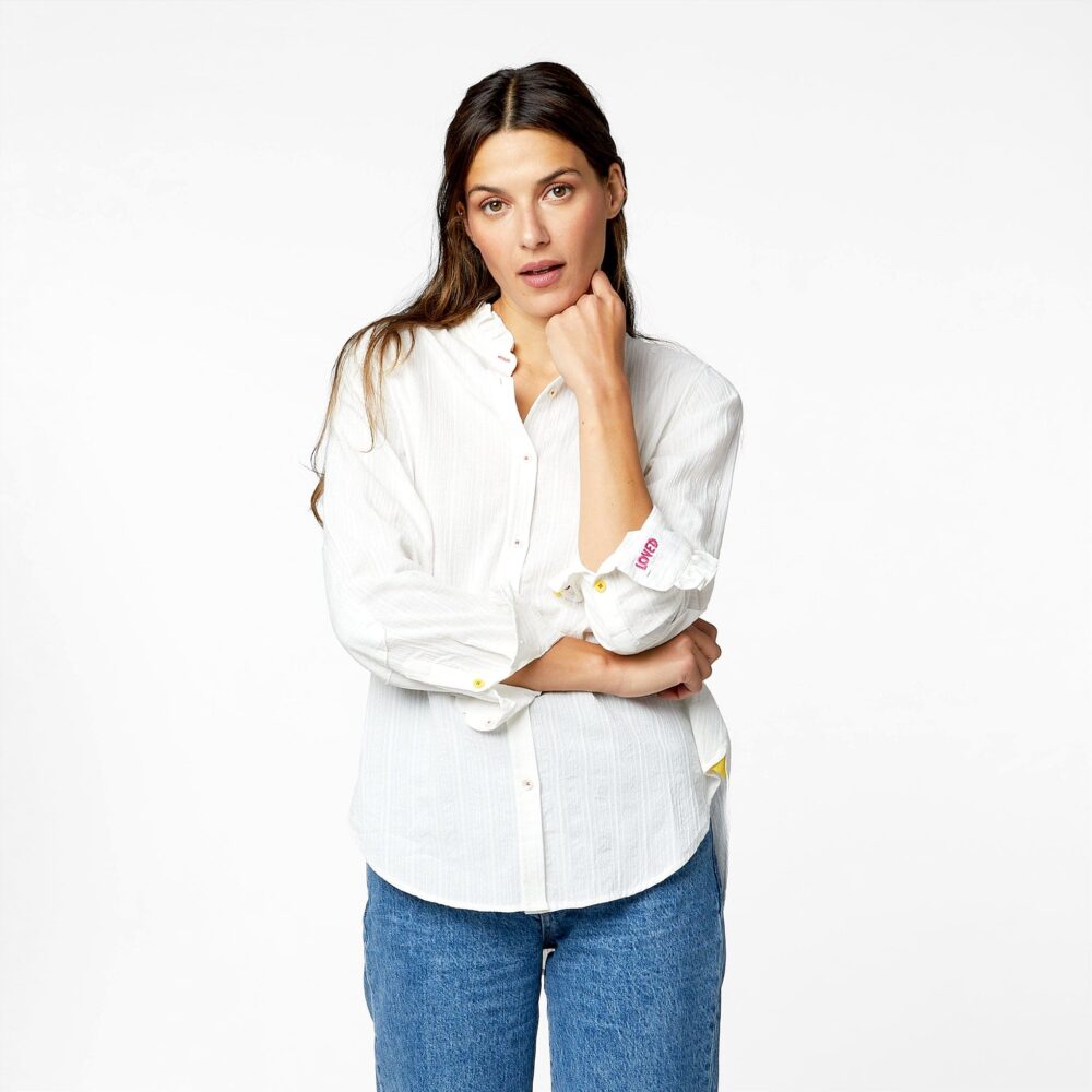 An update to Kerri’s classic Mia Ruffle Shirt! Super chic and wearable, with soft ruffles on the collar and sleeves. Includes subtle contrast details, such as a hidden, embroidered ‘loved’ tattoo on the sleeve and a tiny, embroidered, unexpected heart. We’re layering the Mia Ruffle under all of our sweaters and blazers…or wearing it solo for a modern-classic, always comfy look.