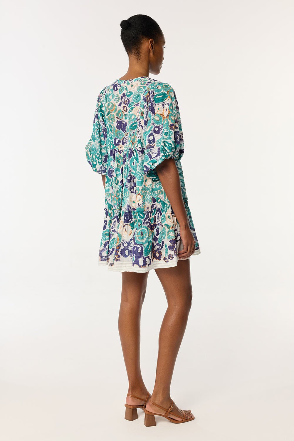 Featuring three-quarter balloon sleeves and a subtle flounce on the skirt, it is lightweight and fluid.