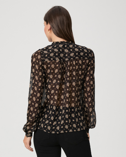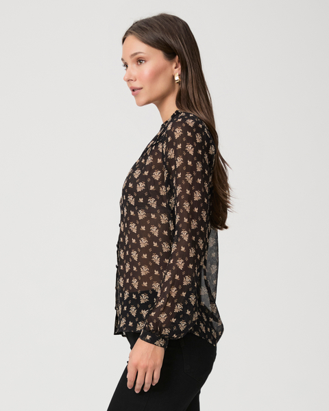 A timeless silhouette crafted from luxurious 100% crinkled silk georgette in a gorgeous black victorian floral print. This long sleeve blouse is feminine, elevated and chic with a curved yoke at the front with shirring details, covered buttons down the front, and ruffles at the neckline.