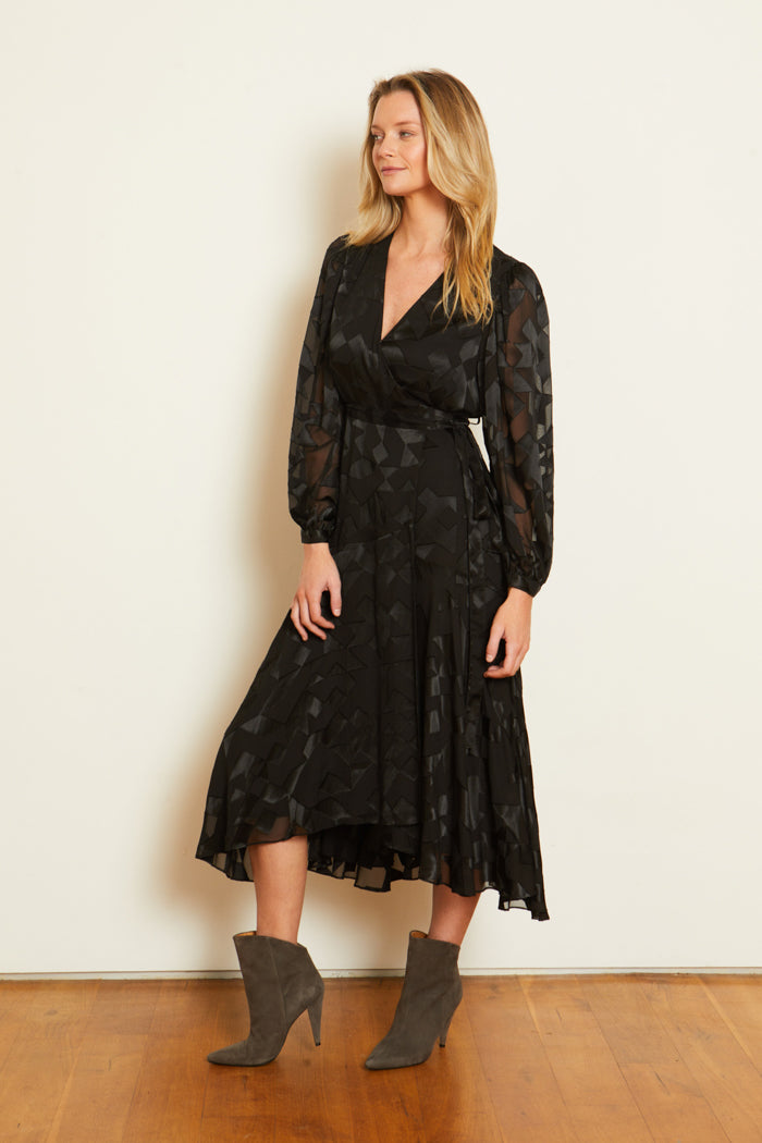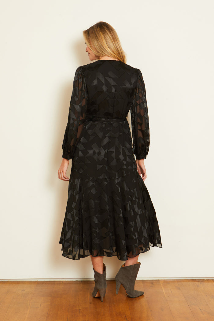 Crafted from black velvet burnout fabric with a subtle sheen and a mesmerizing all-over triangle print, this luxurious maxi dress is a show-stopping piece, perfect for special occasions or nights out.