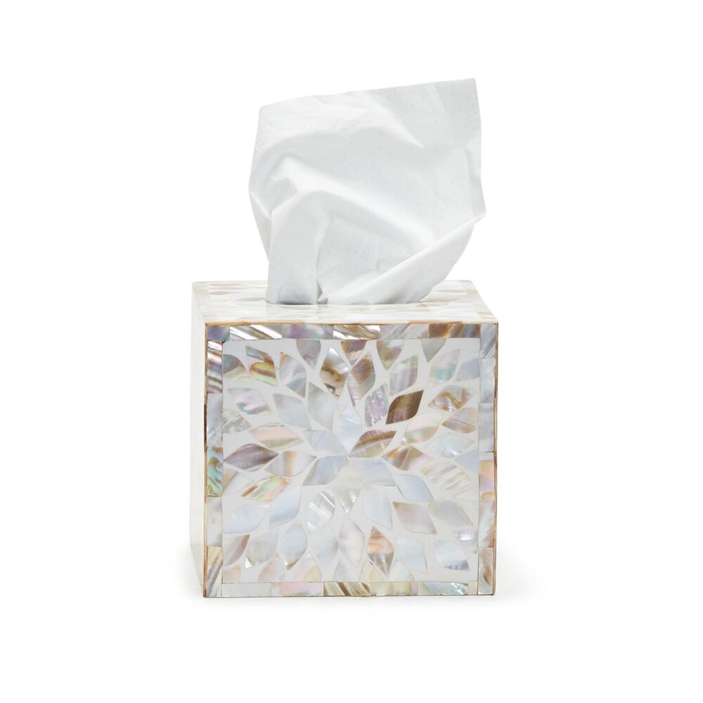 Indulge in the epitome of luxury with our exquisite Tissue Box Cover, meticulously crafted from the finest quality resin materials, designed to effortlessly complement any discerning home aesthetic. The square design of the Tissue Cover showcases delicate handcrafted details, featuring natural Capiz shells arranged in an enchanting floral motif. Adorned in a stunning iridescent white and beige color palette, this opulent piece adds a delightful decorative touch to any room, be it your kitchen, living room, office, bathroom, or even your beach house. Impeccably designed, the Decorative Square Tissue Holder boasts a durable crafted base that smoothly slides in and out, allowing for seamless tissue box changing while discreetly enveloping the entire box for unparalleled convenience. The generously sized oval opening on top ensures an effortless experience in retrieving tissues, eliminating any hassle.