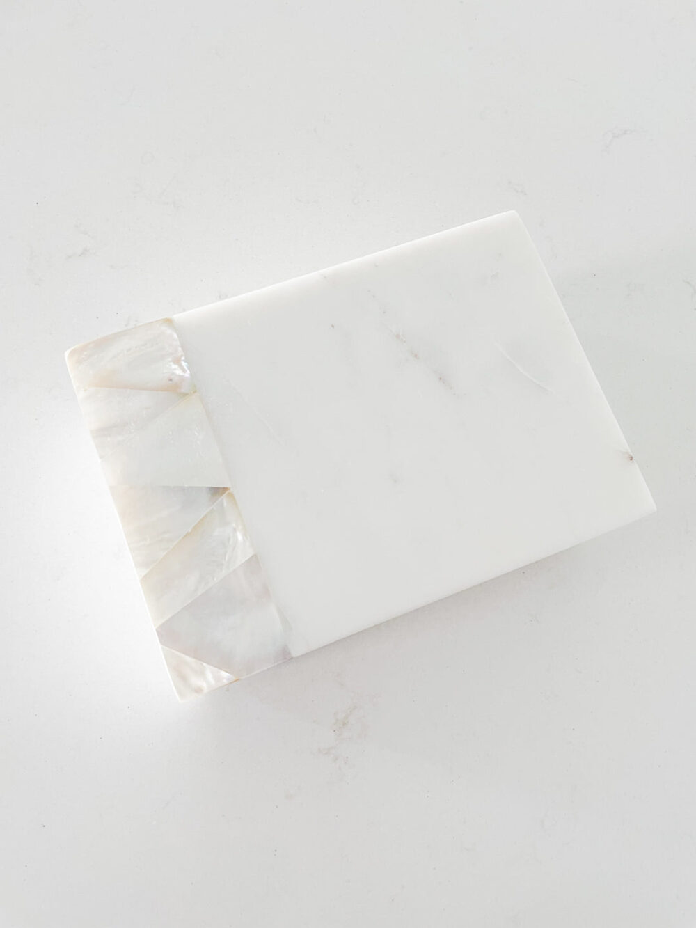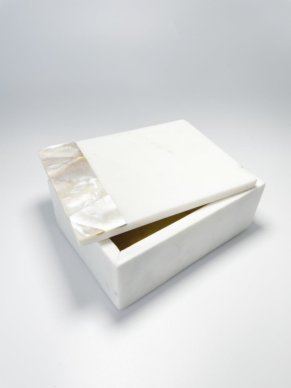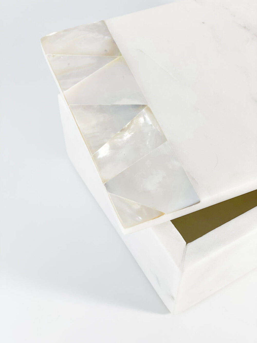 The Mother of Pearl White Marble Decor Box is accented with Genuine Mother of Pearl with a natural Iridescent White color tone with hints of light golden accents.