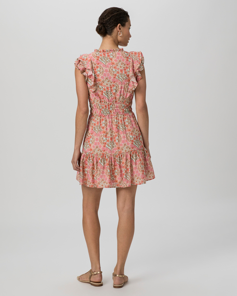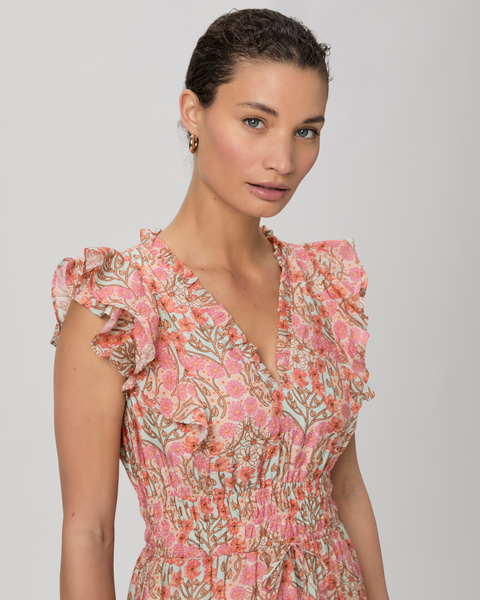 Crafted from a light and airy textured rayon material, this floral short sleeve mini dress has ruffles at the sleeves and neckline, an elastic waist with a tie detail, and a tiered skirt. Pair the Muriel Dress with sandals during the day and heels at night for an effortlessly chic look.