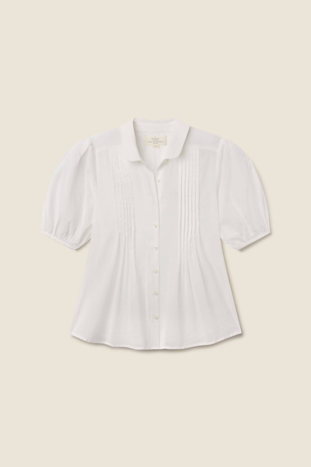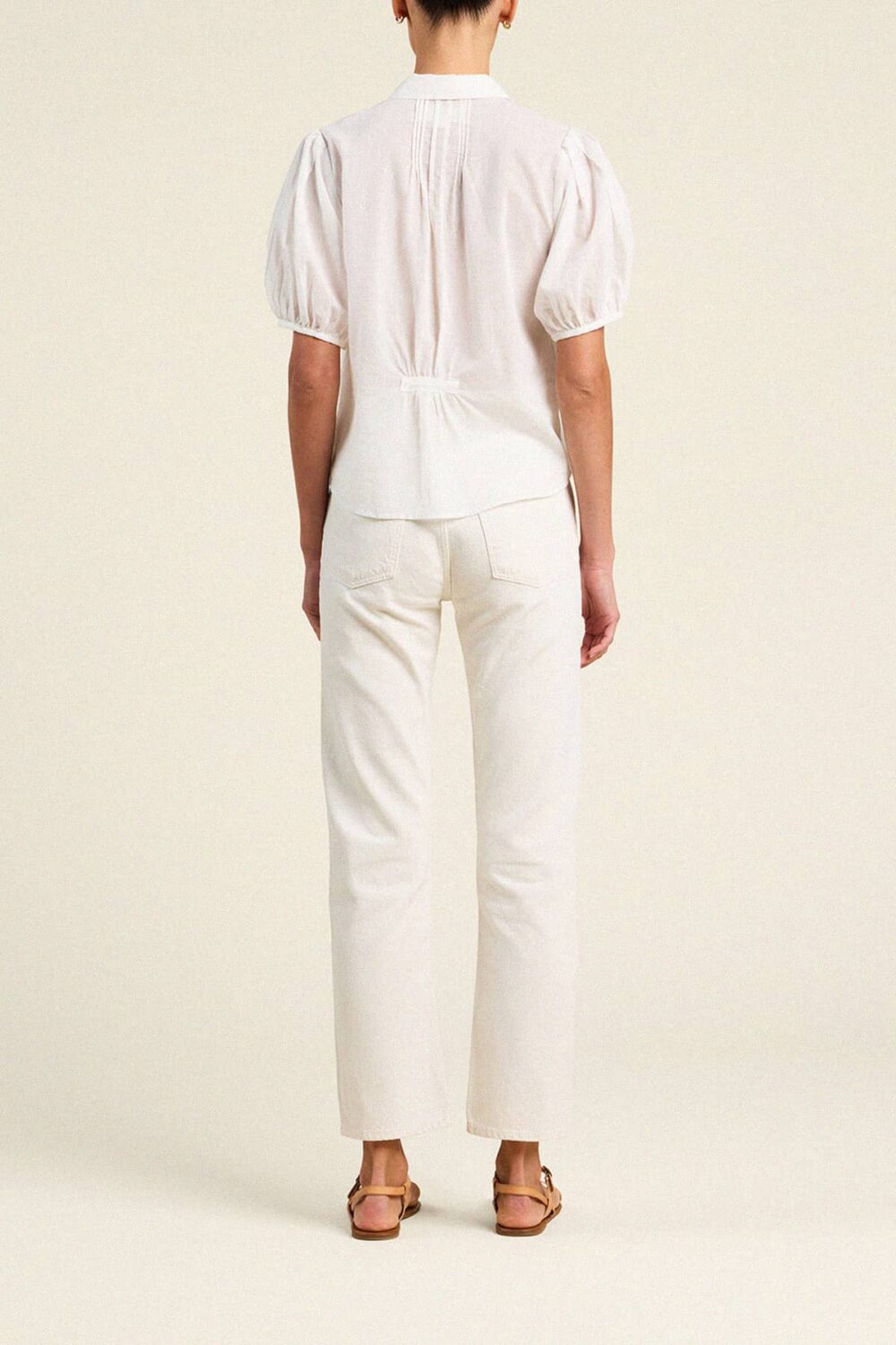 The Nadine Blouse is a short-puff sleeved blouse with a flattering curved hemline and petite pintucks that lend texture and hand crafted charm. Slightly cropped length keeps this blouse airy and whimsical. Shown here in White and made from cotton voile.