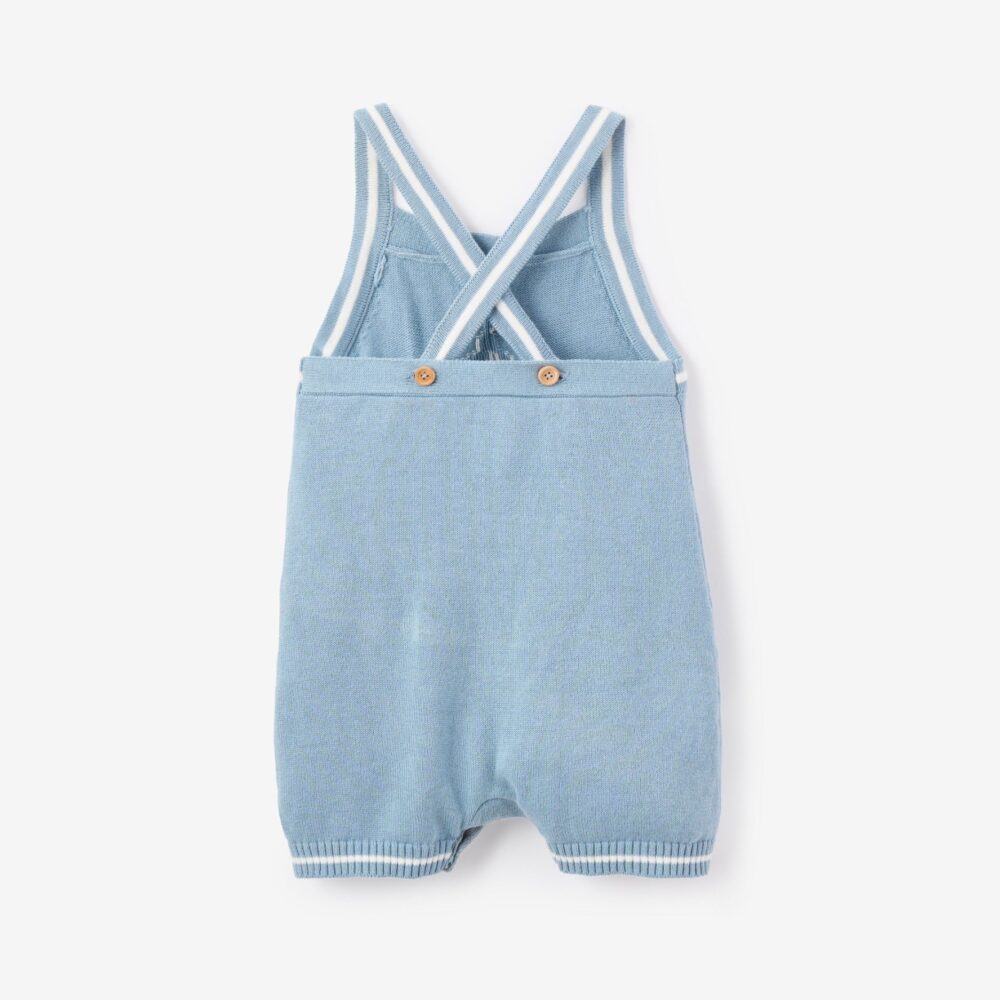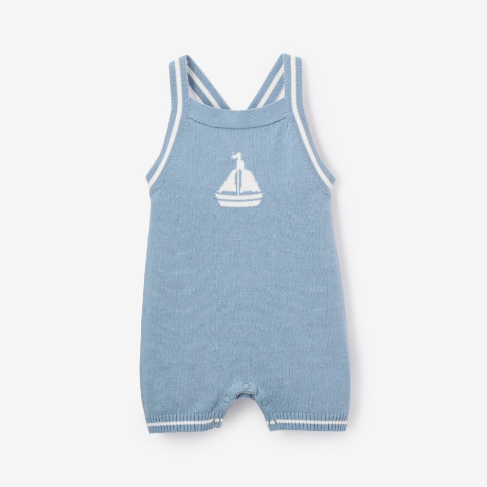 A nod to classic Parisian seaside style, this blue nautical knit short overall features a charming jacquard sailboat and white stripe details. With a timeless cross-back design, it’s perfect for breezy summer days by the shore.