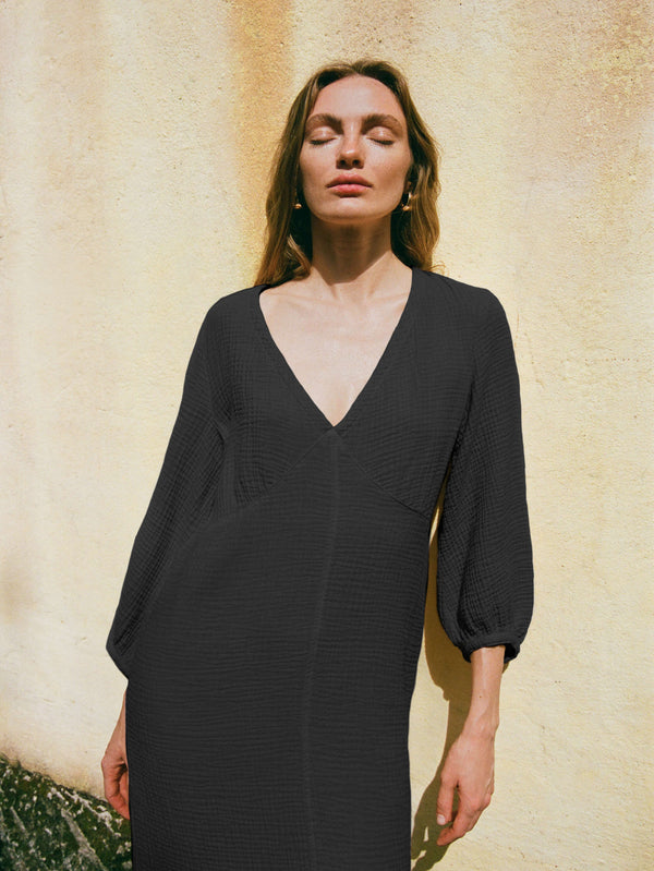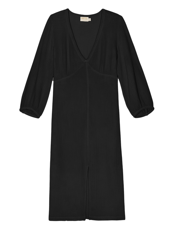 Wear it all season (you know you want to). This elevated midi dress has a V neck and a cheeky front slit, all in breezy Double Gauze, AKA the fabric of summer.