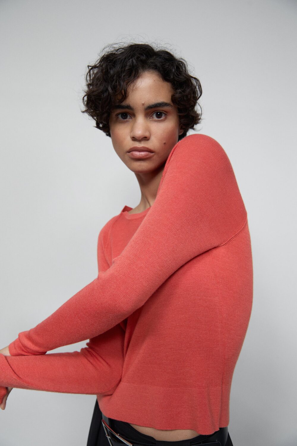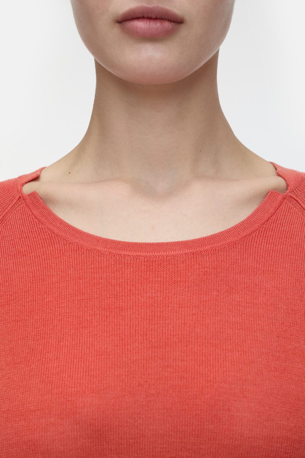 The fine knit jumper is made from organic merino wool with a light silk content. This gives the slim-fit top a slightly shiny look. With cut-outs in the collar cuffs and a clear seam around the sleeves. A wider cuff adorns the straight hem.