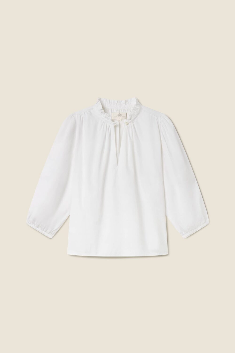The Orly Blouse is a slightly cropped, billowy blouse with straight bottom hem, split v-neckline and buttoned crown collar. Gathered three-quarter length sleeves finished with delicate bindings. Includes signature back detail with a gathered waist tab. Shown here in White and made from our cotton twill.