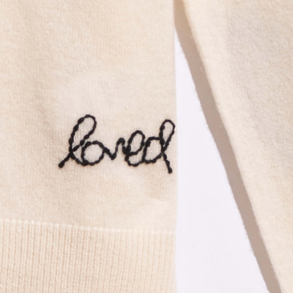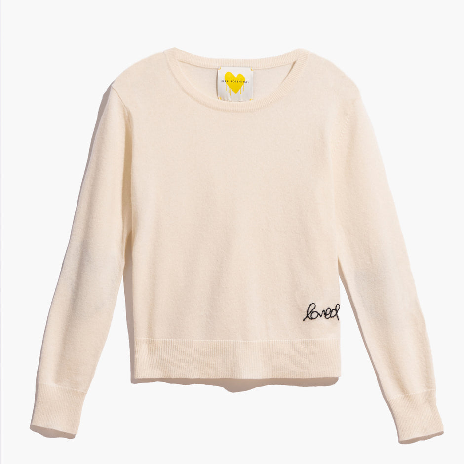 The most love patchwork pullover sweater in lightweight cashmere, updated with a classic finish (no more slits!). Heart elbow patches, and hand stitched loved on the bottom of the cashmere sweater.