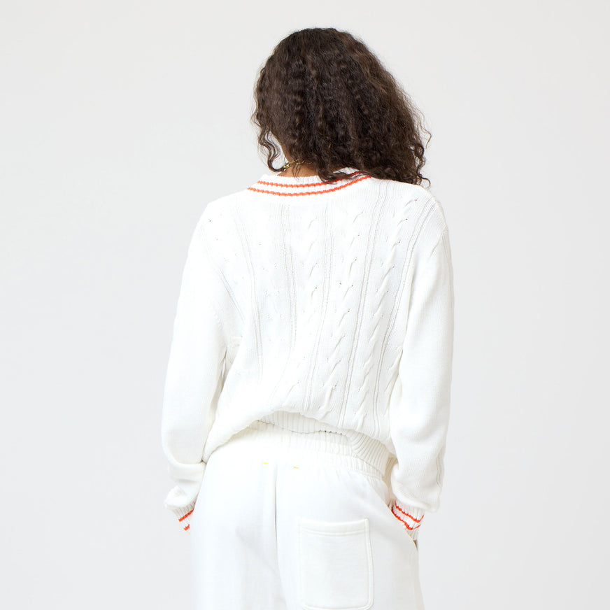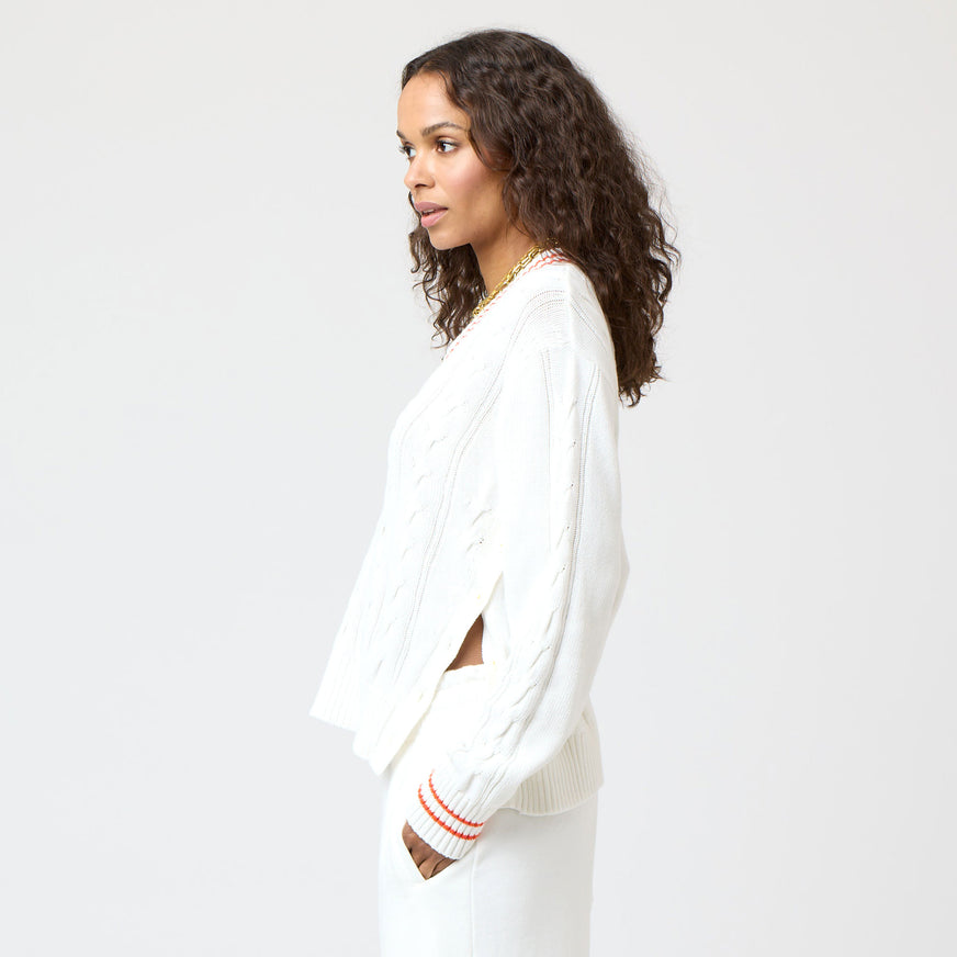 The Patvee V-neck Sweater is designed with a cable stitch and made from 100% cotton. Featuring a color-blocked rib and shell buttons at the side slits, this is the perfect KR spring-into-summer white pullover sweater.