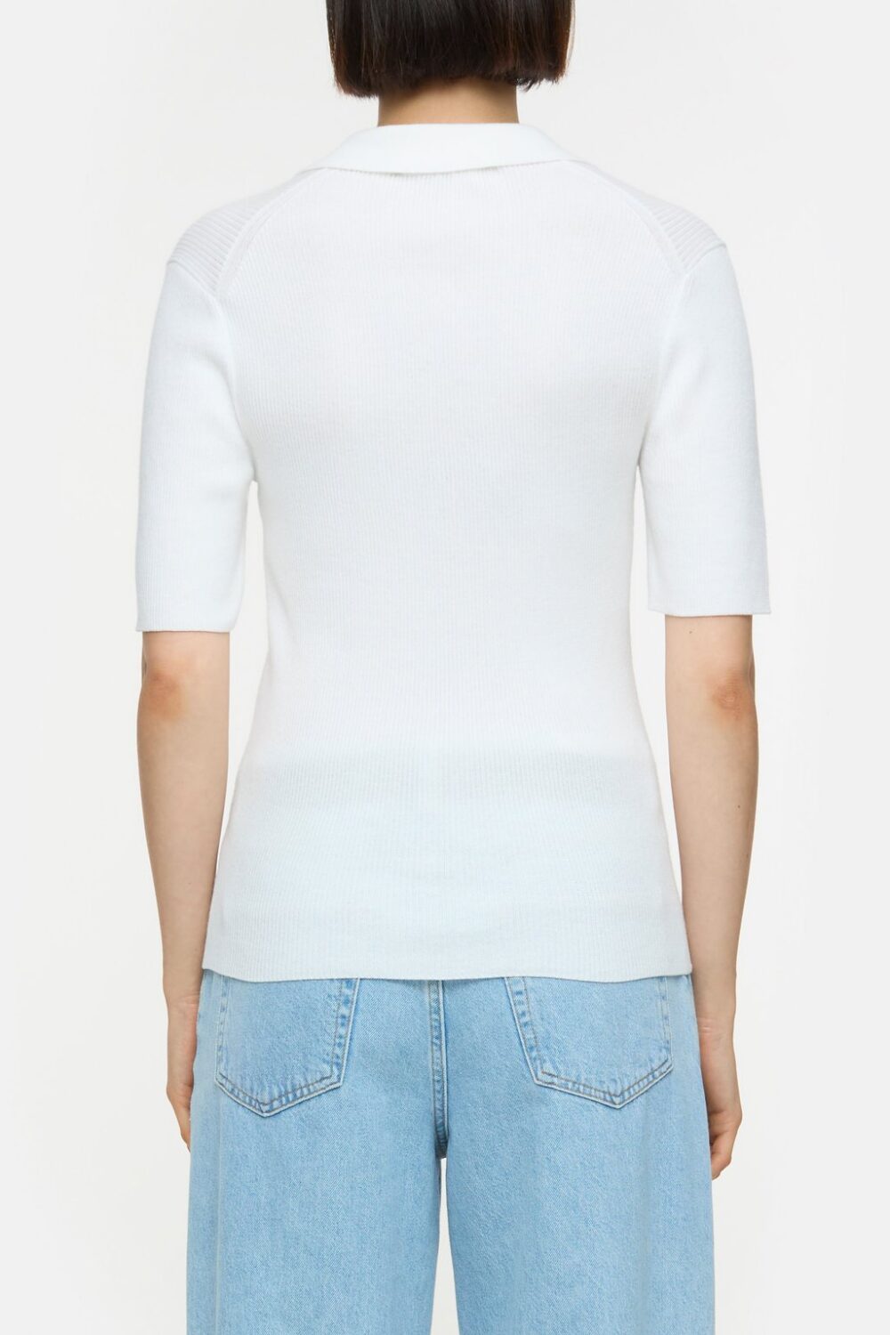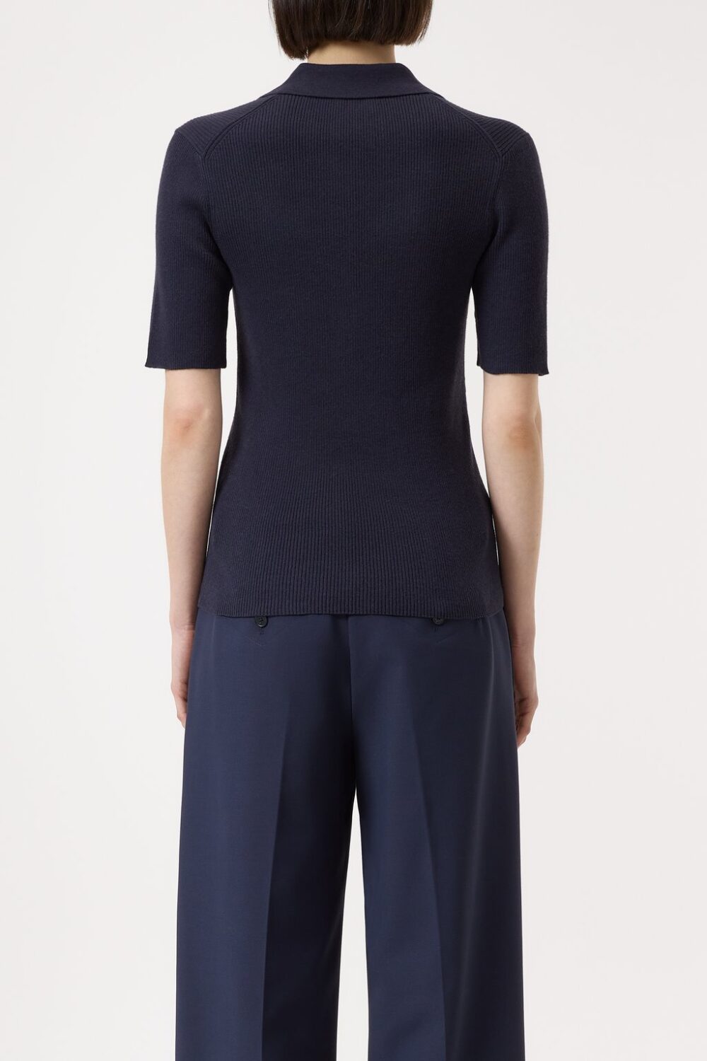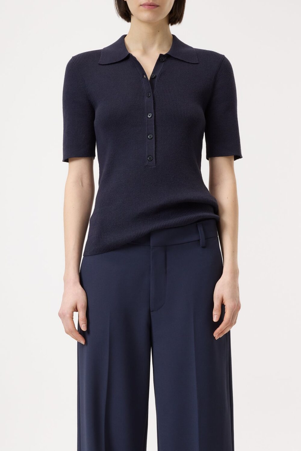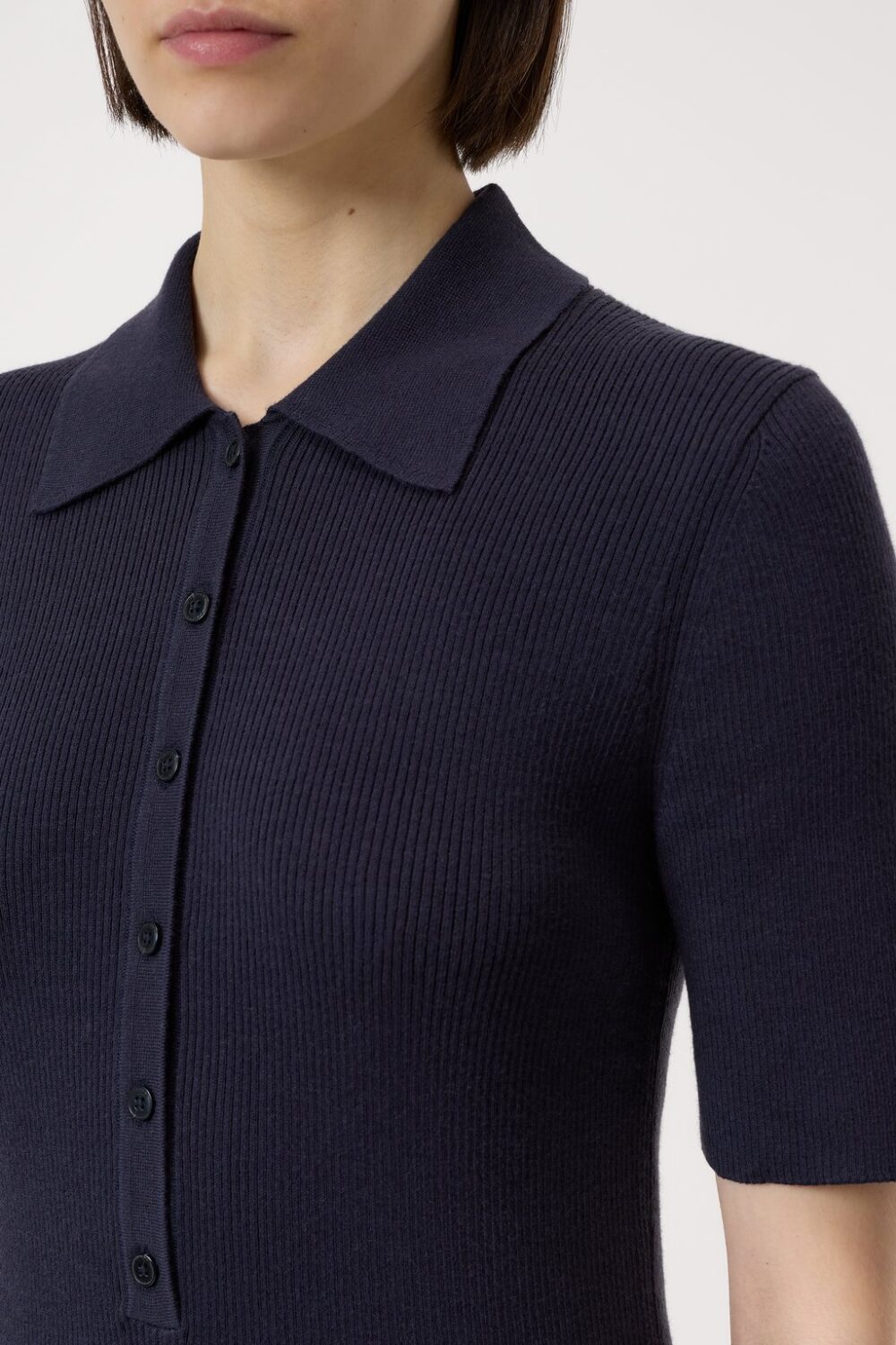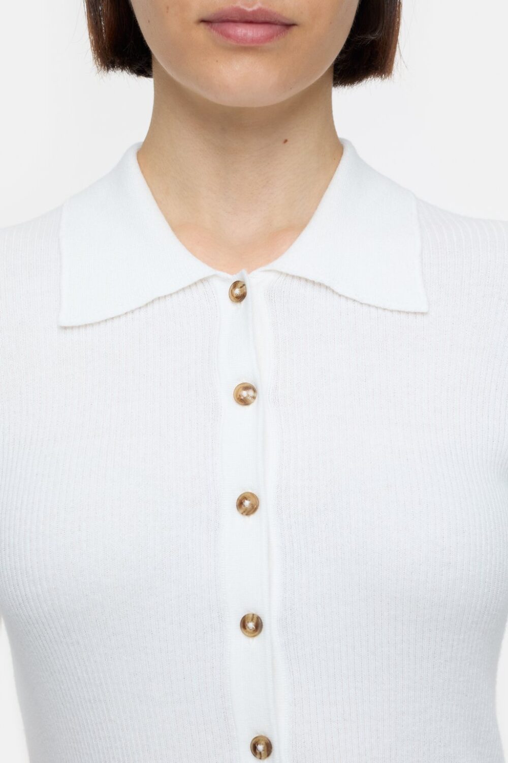 Knitted from the finest cotton-cashmere blend (14 gg) in Italian quality: finely ribbed shirt with a polo collar and button placket in a slightly transparent look. In a close fit with small horn-look buttons and straight sleeve and hem ends.