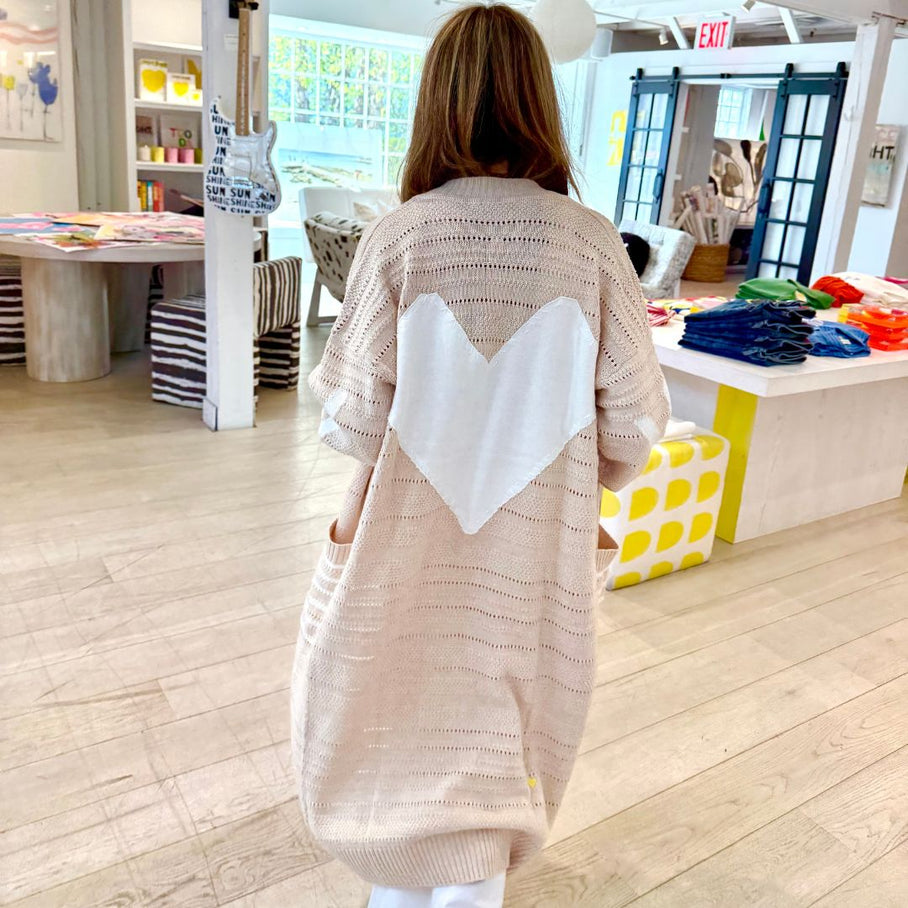 The Poppy Duster is back, featuring Kerri’s Lovey Heart artwork on the back and LOVE patches on each sleeve. This open knit cotton duster is a perfect summer layer over jeans, shorts or anything else!
