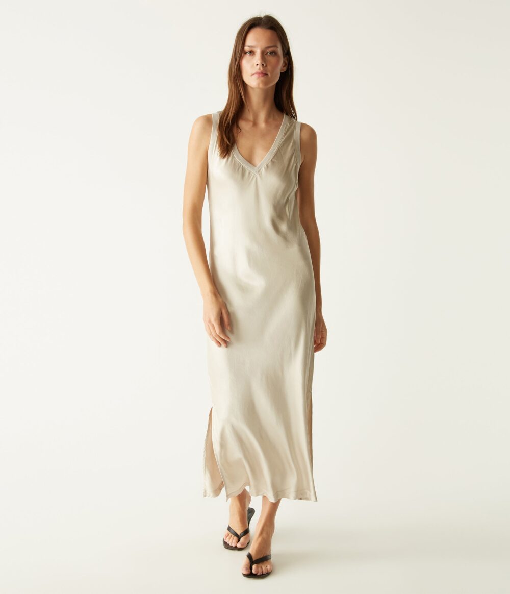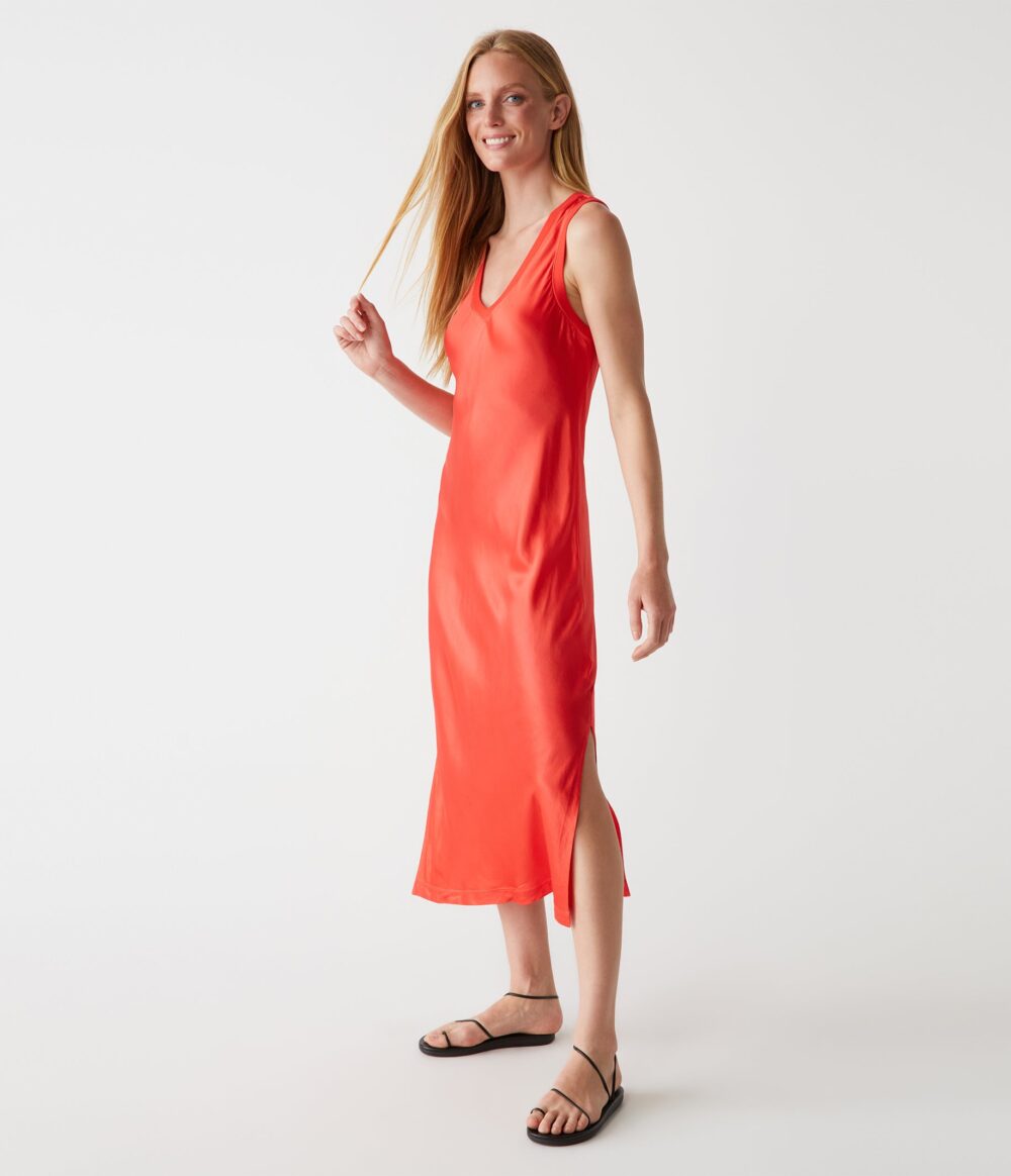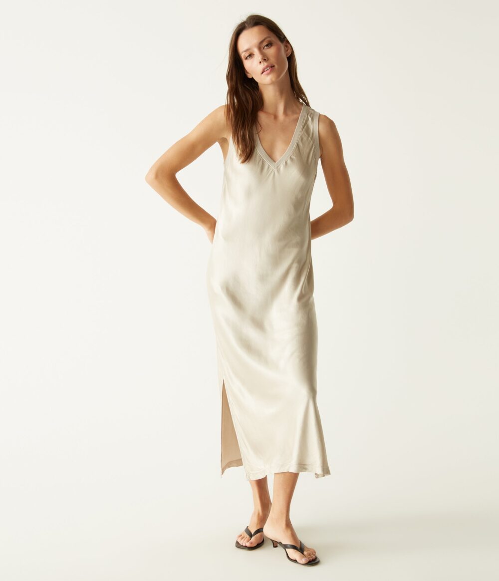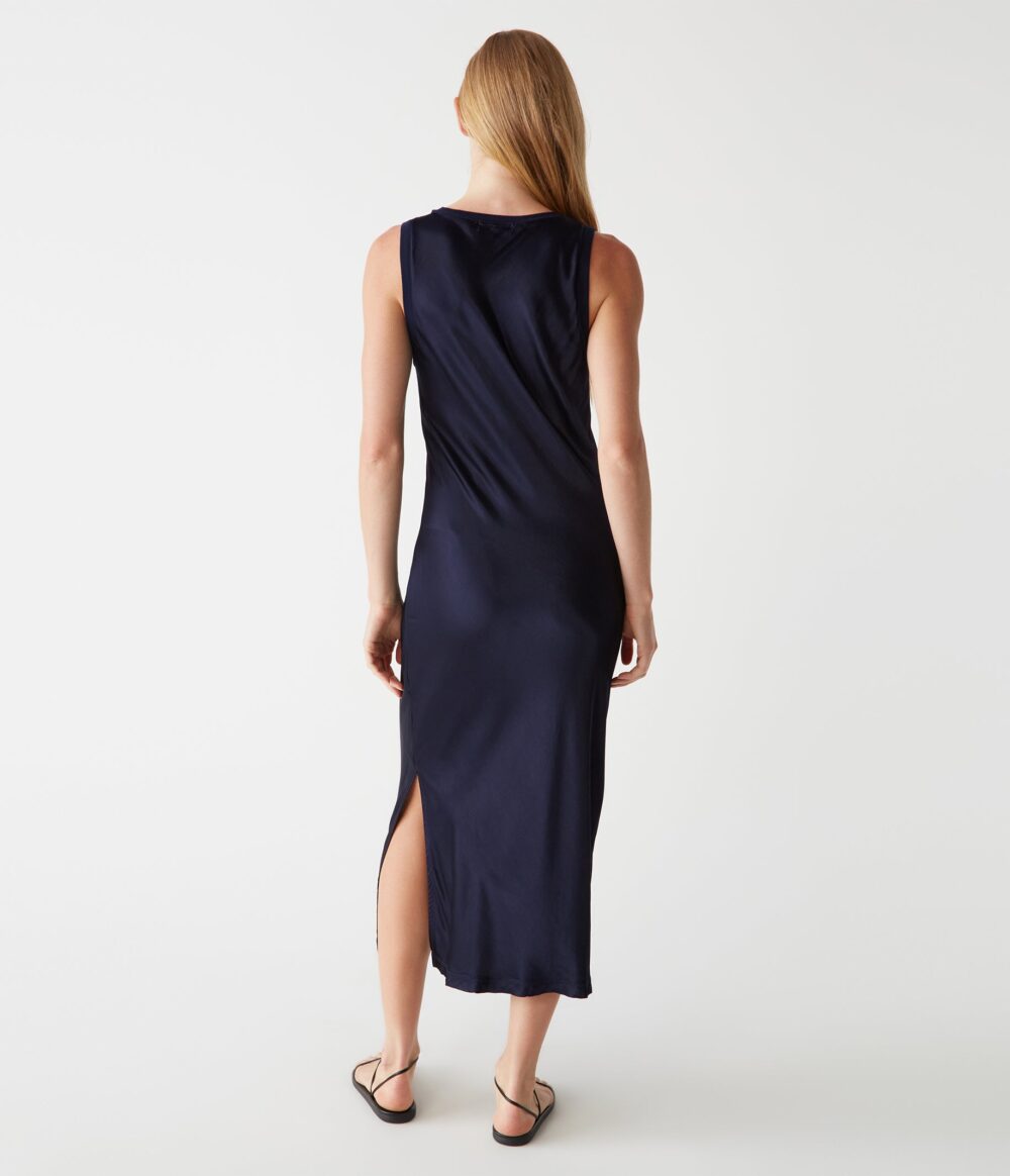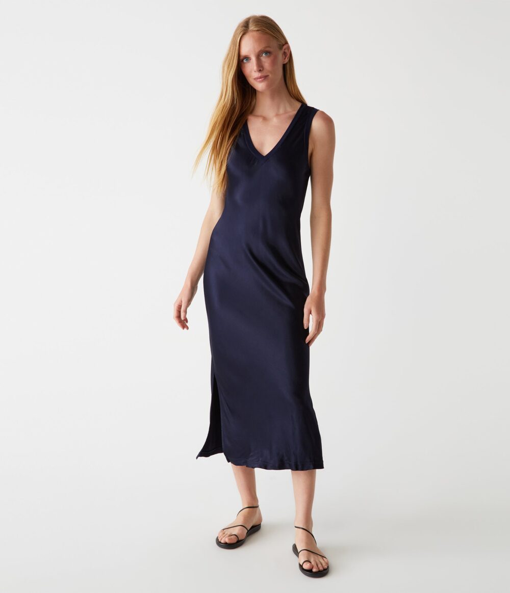 The Randi is a luxe midi dress is cut on the bias and crafted from our made-in-LA satin for a beautiful drape. Perfect for layering under your favorite sweater, or over your favorite turtleneck.