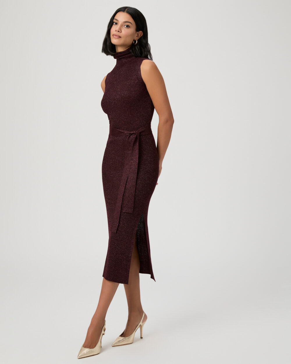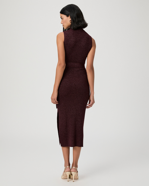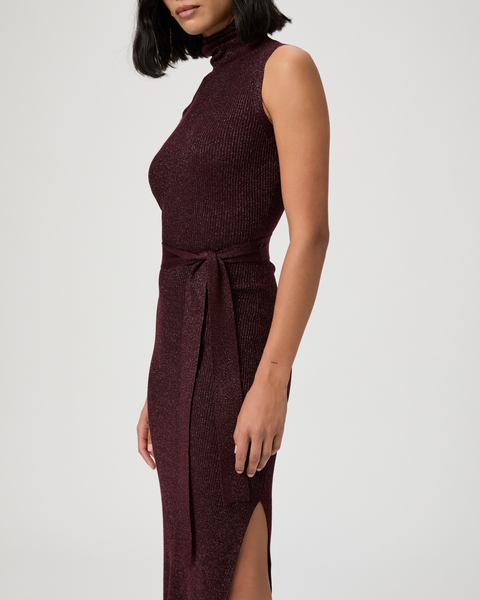 Made from super soft peachskin yarn with metallic threads woven throughout, this burgundy sleeveless midi dress will be a holiday party go-to. Detailed with an easy, subtle cowlneck and a self-belt at the waist, the Zoelle Dress offers the perfect amount of shine for a chic and elevated look.