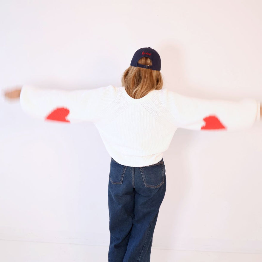 Our new love, meet the Ricki! With a slight balloon sleeve and contrast imperfect heart elbows, this cotton crewneck will be your new favorite sweater.