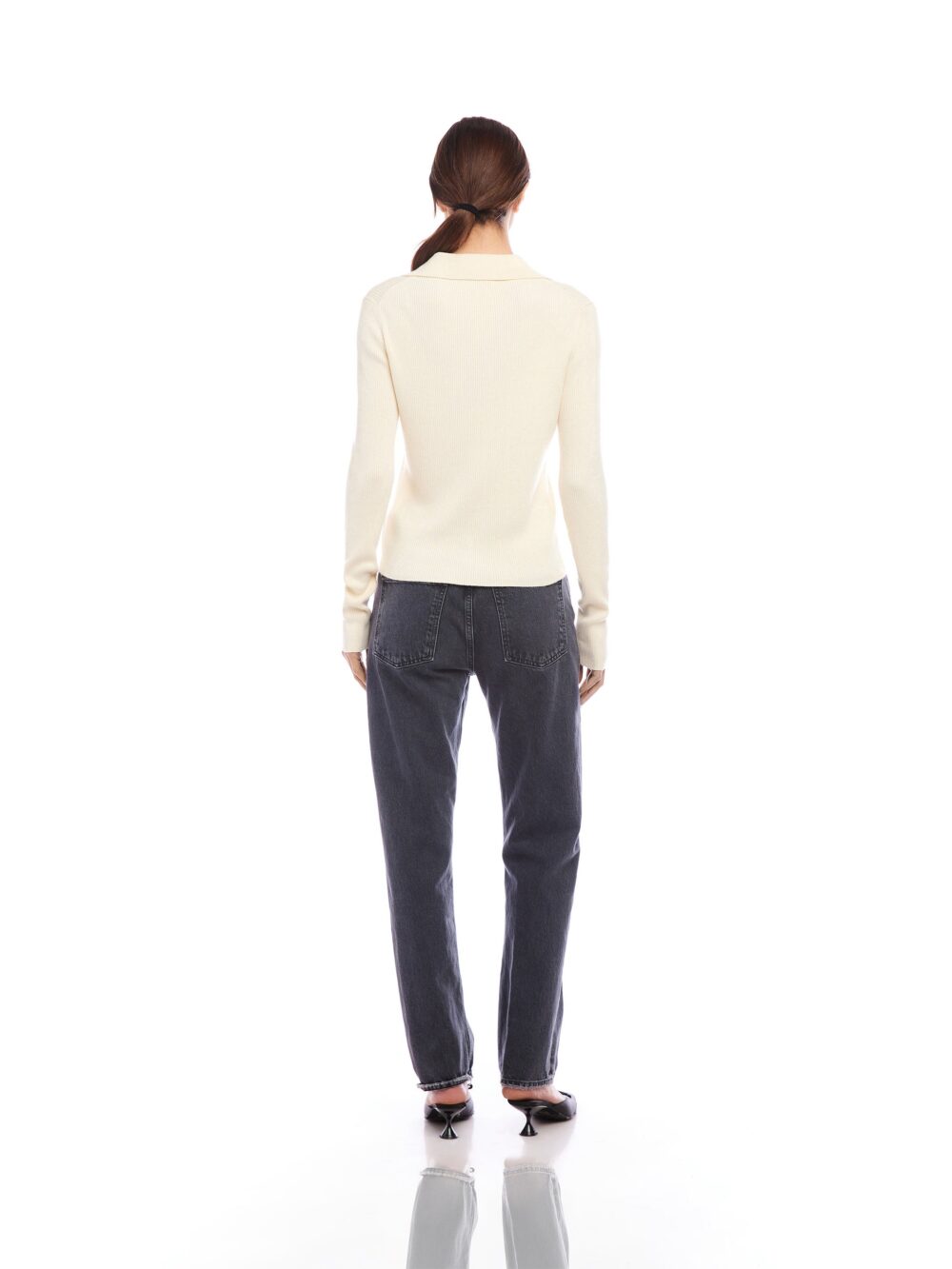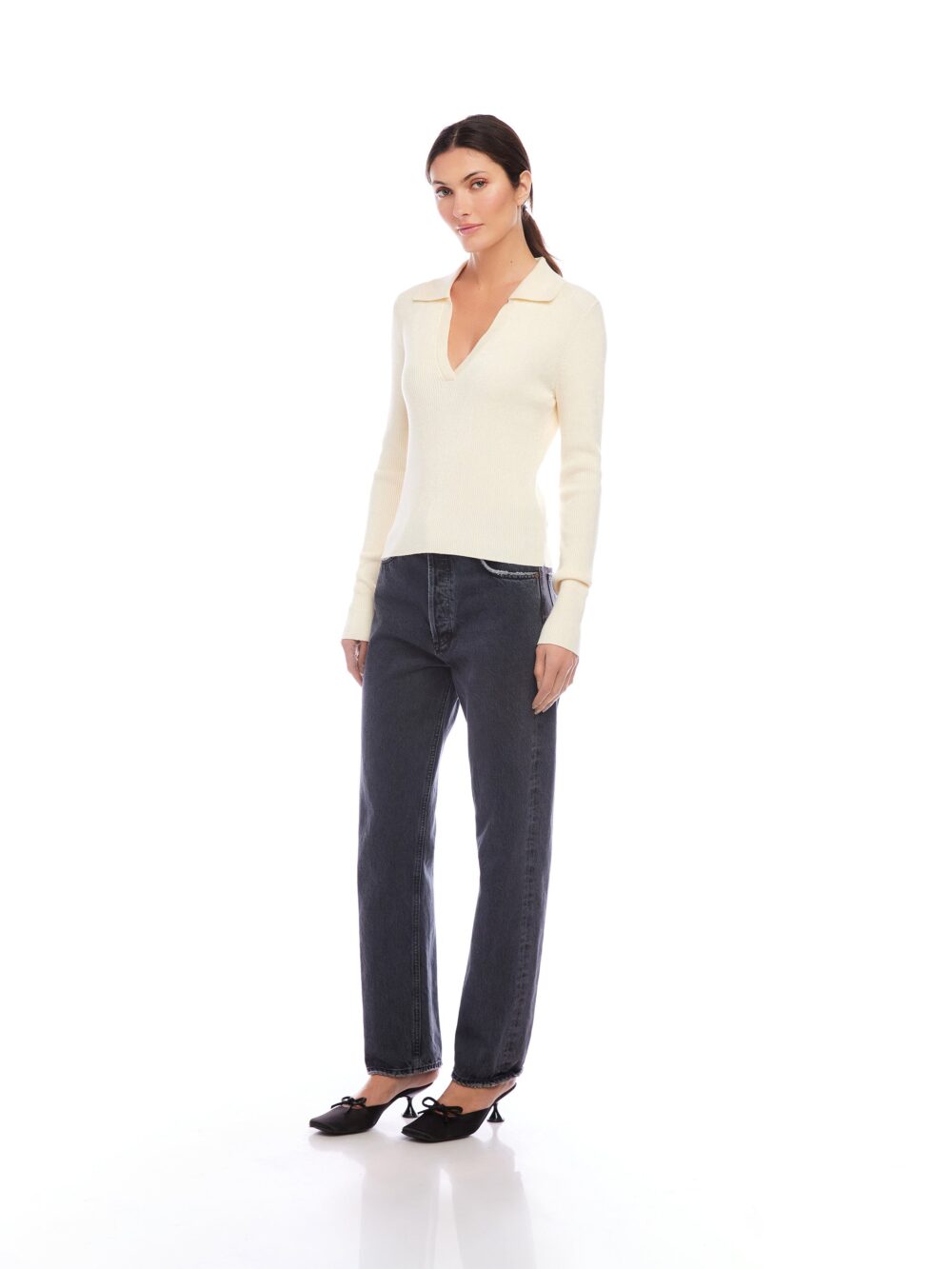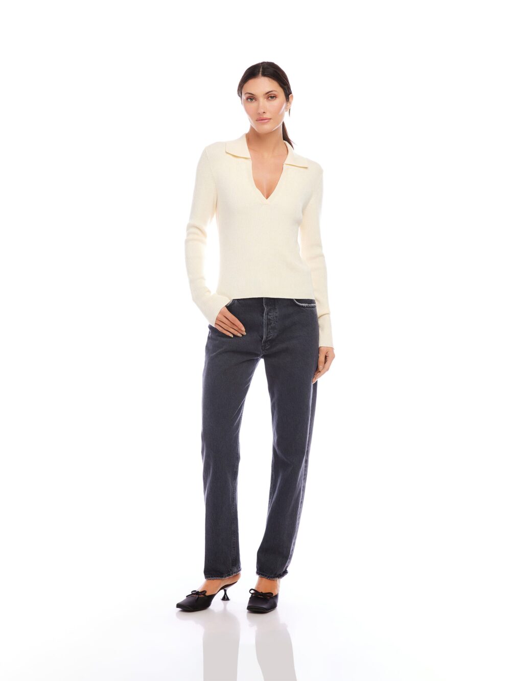 Introducing the Rory Sweater, the perfect blend of comfort and style. Made with a luxurious cashmere blend, this sweater features long sleeves and a collared V-neck for a polished look. The ribbed knit detail adds a touch of texture, making it the ultimate wardrobe essential.