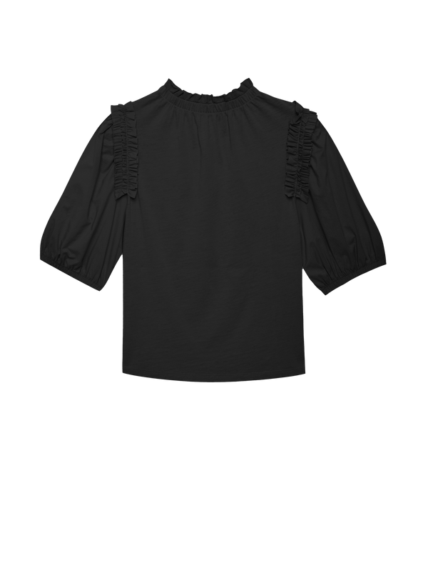 Because dressing up should be easy. Romantic ruffle details at the neck and contrast cotton poplin shoulders, a back buttoned keyhole for easy on and off, and of course, a shirred puff sleeve.