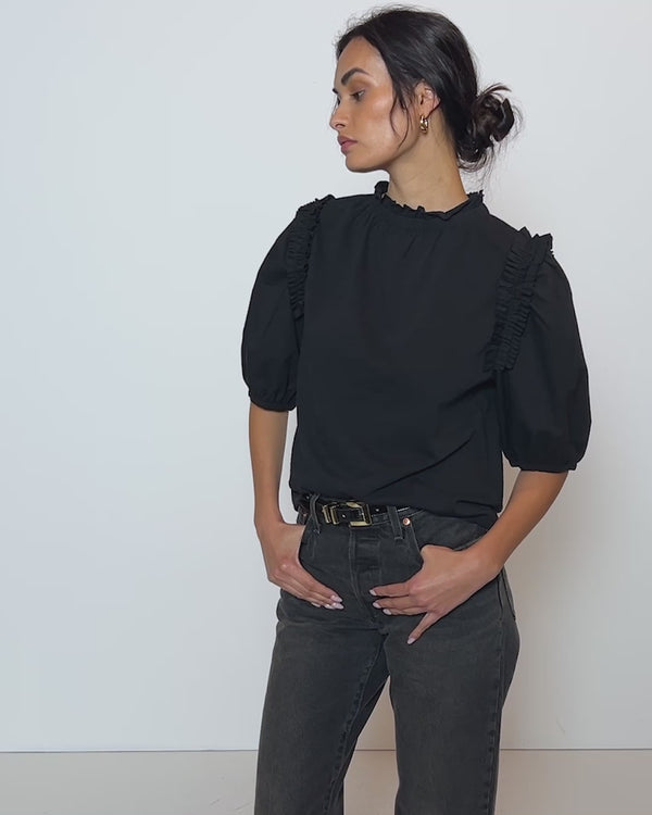 Because dressing up should be easy. Romantic ruffle details at the neck and contrast cotton poplin shoulders, a back buttoned keyhole for easy on and off, and of course, a shirred puff sleeve.
