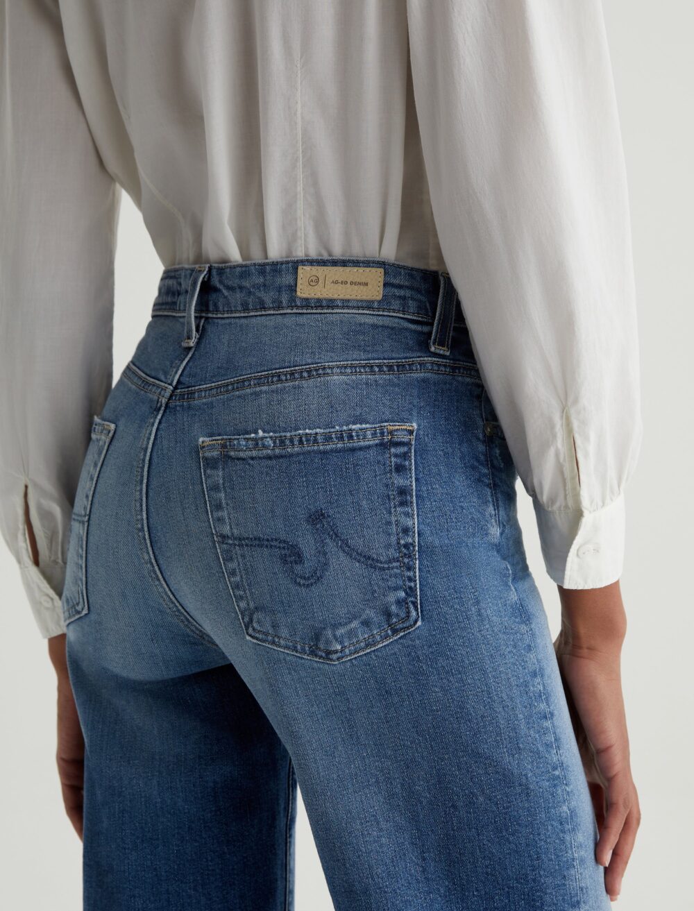 Saige Wide Leg Crop features a mid-rise waist and loose, cropped legs with stringy raw hems. Designed in Vintage Comfort Stretch Denim from Italy, these five-pocket jeans have a medium indigo AG-ed™ wash with fading, worn edges, and touches of distressing at one of the hip pockets.