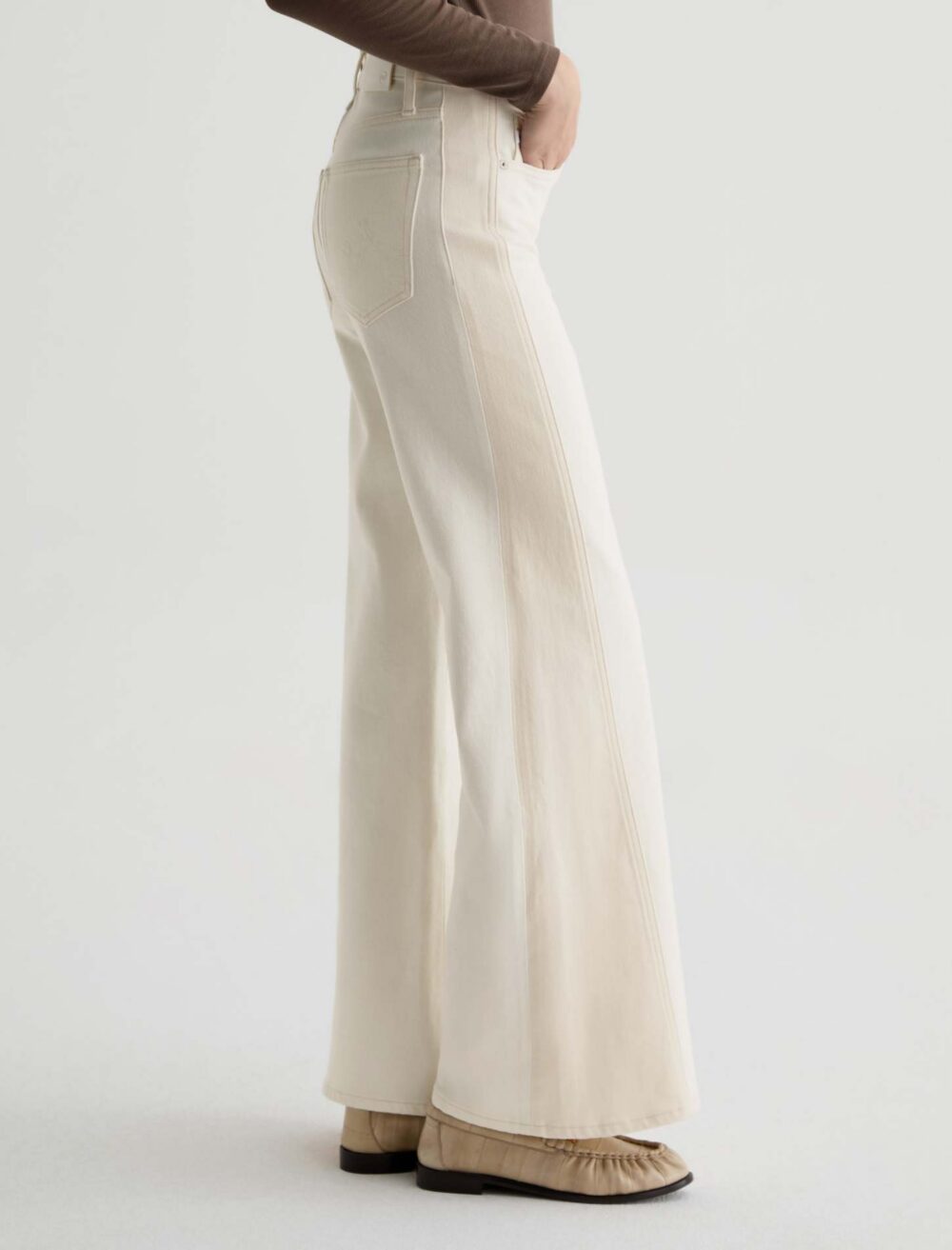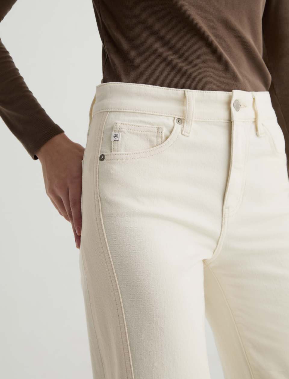 Saige Wide Leg is crafted in Natural Weave Denim from the renowned Candiani Mill in Italy. This mid-rise jean is adored for its easy, relaxed silhouette and effortlessly stylish look. Designed in our nearly-white wash, Powder, and subtly contrasted by side panel detailing in our off-white wash, Ecru, for a sleek, slightly slimming effect.