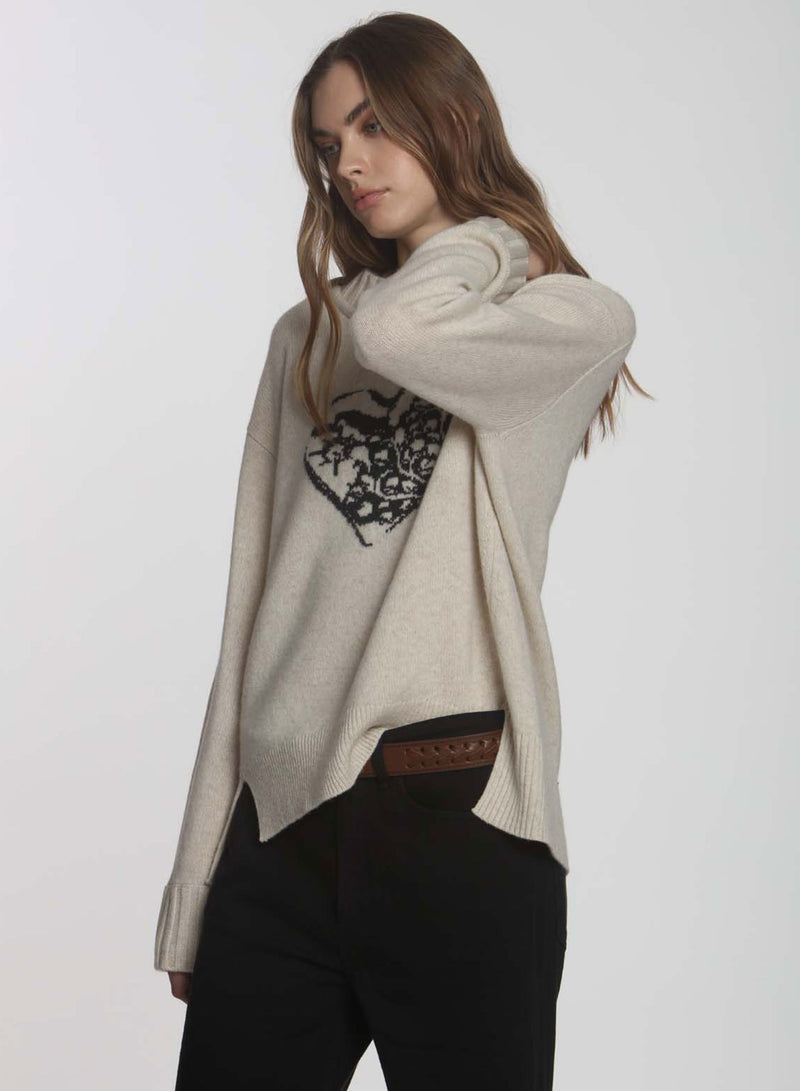 The Scroll Heart has a graphic intarsia pattern centered on the front panel inspired by a heart-shaped jewelry charm. The loose-fitting midweight sweater is knit in a cashmere wool blend and is finished for ultimate softness. The side seams are pitched forward with different bottom rib heights and a slit at the sides. The cuffs are chunky ribs and the neck features a jersey roll. Wear with denim, put on your boots on a chilly fall day, and seize the day!