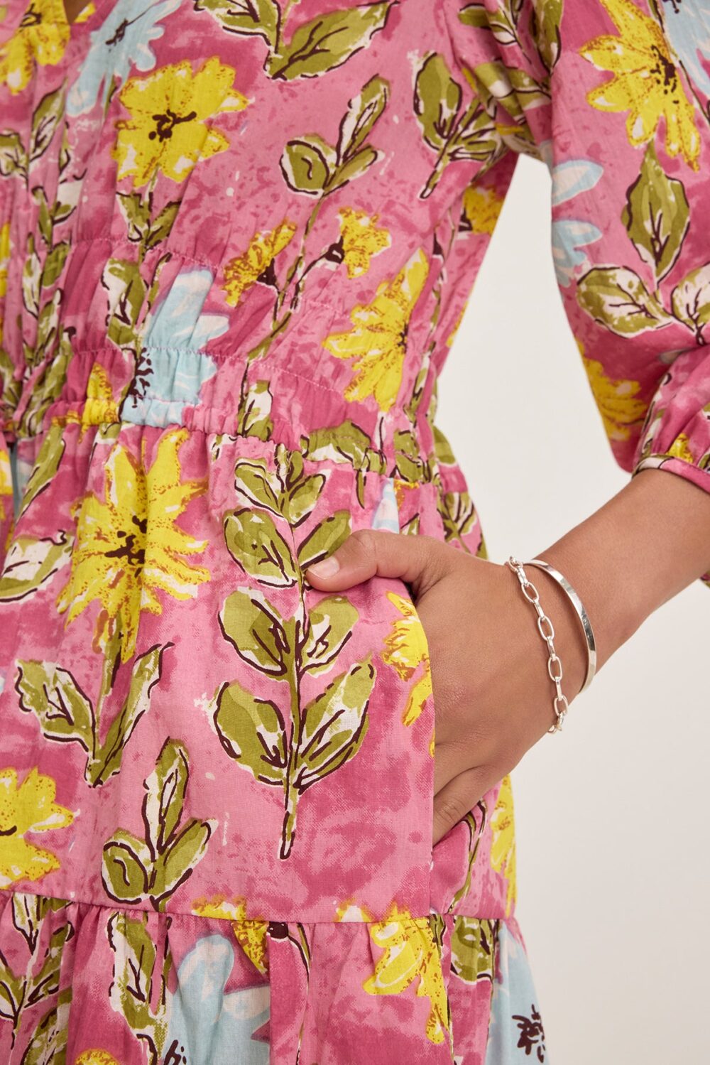 Crafted from lightweight floral-printed cotton, this mini dress offers a flattering v-neckline and smocked elastic waist with a drawstring tie. 3/4 sleeves, a ruffle hem, and side pockets add practical details, while the lined construction ensures a comfortable fit.