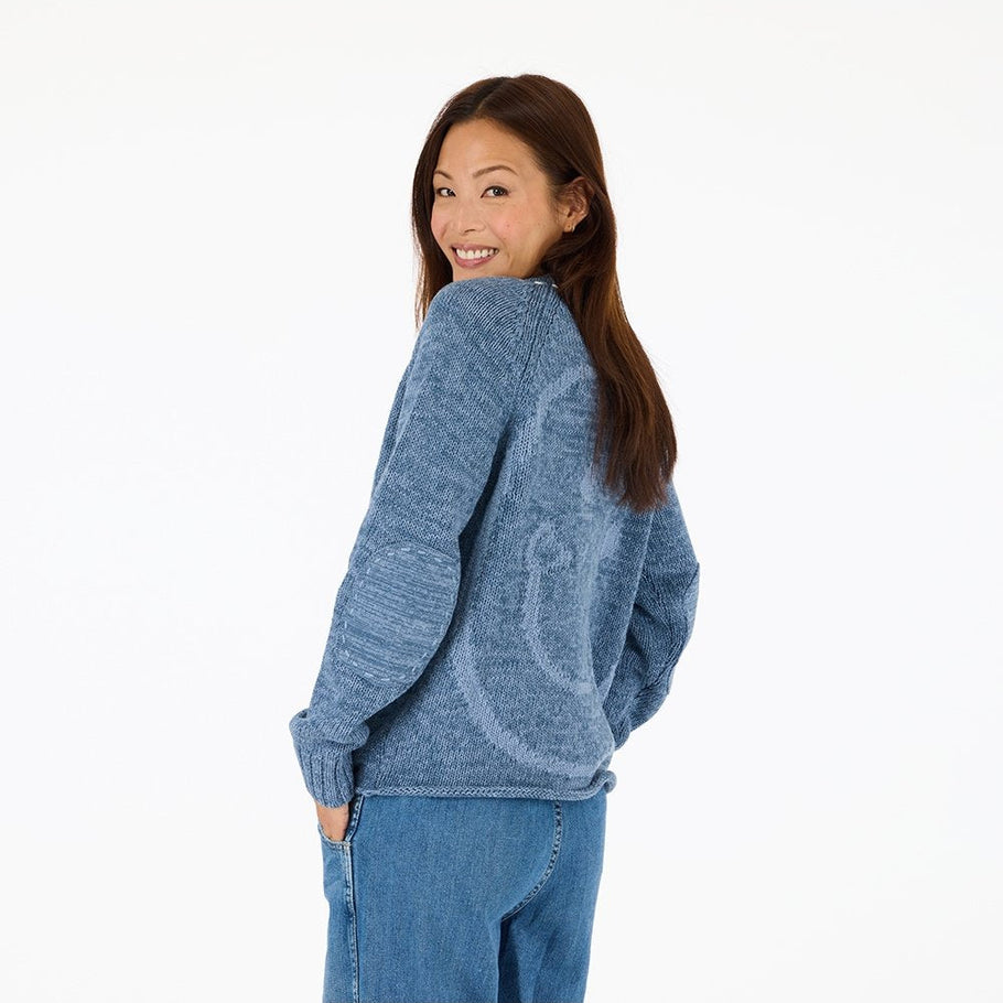 Introducing the Short Poppy Smiley Cardigan in indigo blue. A collectors item with contrast stitching, front pockets and a tonal smiley face on the back.