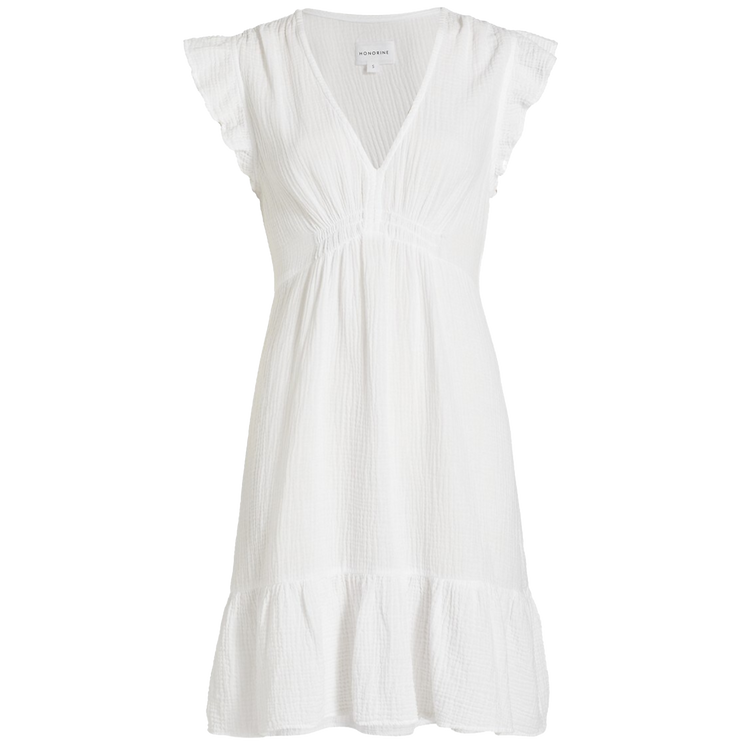 Short Ruby dress features a v-neckline, flutter sleeves, bottom flounce, and is composed of double gauze, ensuring your dress is fully opaque.
