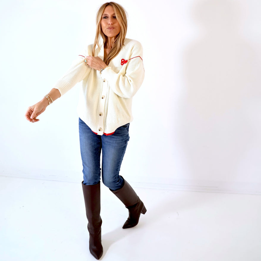 Limited Edition! KR’s most loved slouchy cardigan now in a cozy natural cotton with cherri red details inspired by Kerri’s “Live, Breathe & Love” artwork. A classic you will reach for again and again, made with heart.