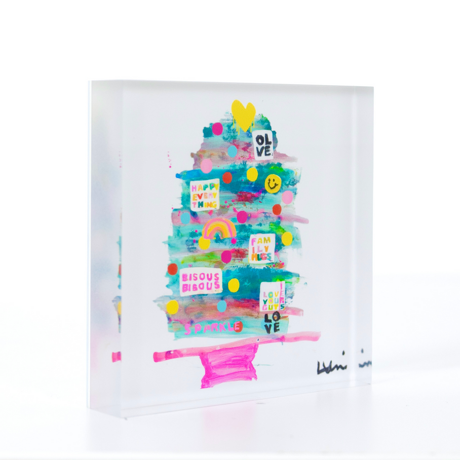 Blocks of Love are signed, mini editions of Kerri Rosenthal’s artwork mounted on 3/4″ plexiglass. Kerri uses them to style a coffee table, night stand or book shelf. She gives them as gifts to friends and sets one on each plate at her dinner parties.